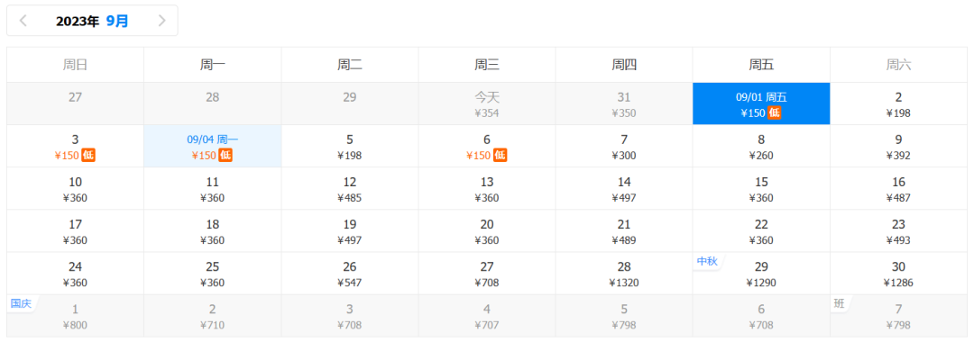 9月去程最低价:150元