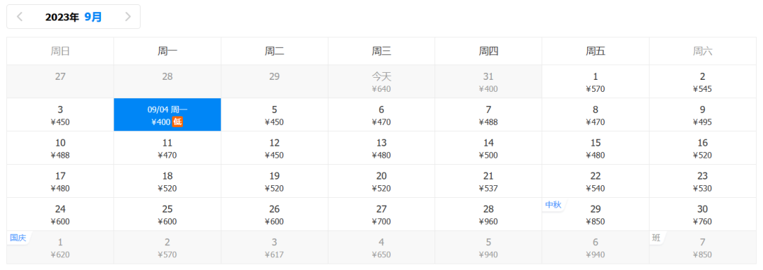 9月回程最低价:400元