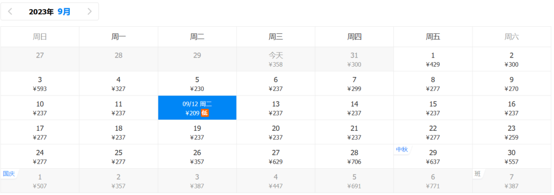 9月回程最低价:209元