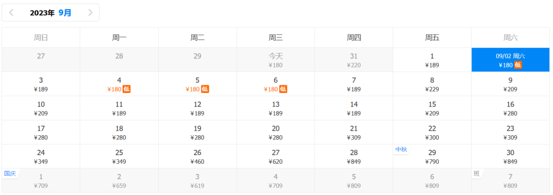 9月去程最低价:180元