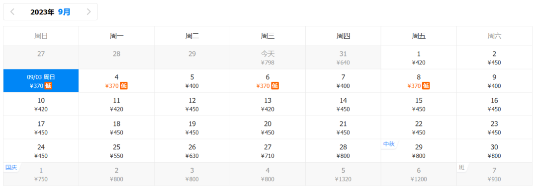 9月回程最低价:370元