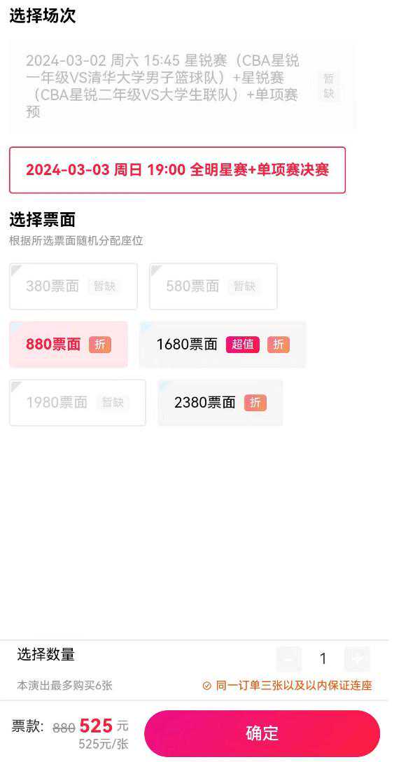 今年全明星赛的官方票务平台为猫眼和大麦网。目前在这两个票务平台上,无论是今天的星锐赛还是明天的正赛,各价位均有余票,且大部分价位均有充足余票。