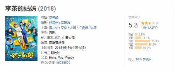 《李茶的姑妈》上映当日,豆瓣评分已降至5.3分(还有进一步下跌趋势)。目前开心麻花系列电影中评分最低的电影。说实话,这评分,如果作为国产喜剧来说,有点儿苛刻;但对于开心麻花的喜剧来说,一点儿不苛刻。
