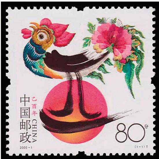 中国第3轮生肖鸡邮票2005《乙酉年》由中央美术学院教授吕胜中创作。该邮票结合中国传统书法和刺绣手法,完美结合传统文化与当代设计,是一枚构图精巧、内涵丰富的生肖鸡邮票佳作。此张邮票当年不对外销售,只赠送给当年邮票的订户,因此被收藏界称为黄金版。
