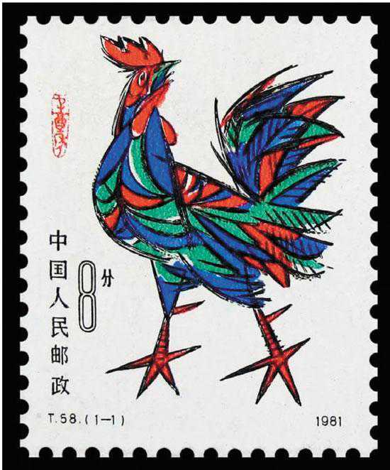 中国首轮生肖鸡邮票由曾参与国徽设计的著名美术家张仃创作。《辛酉年》,图案采用装饰画法,描绘一只昂首报晓的雄鸡,将雄鸡羽毛用各种颜色的色块并置,也是对彩色羽毛的写意。首枚鸡年邮票面值8分,现市场价相比上涨约3500倍,收藏潜力巨大。