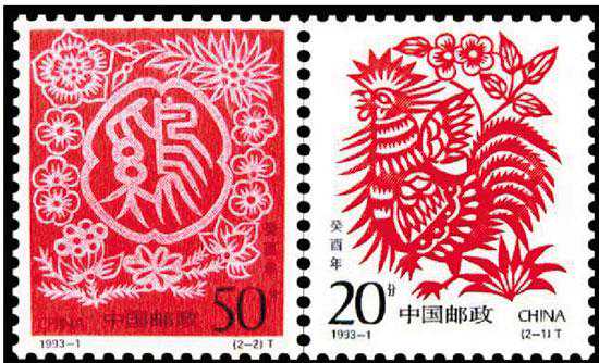 中国第2轮生肖鸡邮票,第一枚剪纸大公鸡象征社会主义祖国在新的一年繁荣昌盛,第二枚篆书鸡字,在造型与线条上衬托出长寿的美好寓意。整套邮票设计得红火、热烈,充满了浓郁的民俗风格,令其鉴赏价值与收藏价值大增。