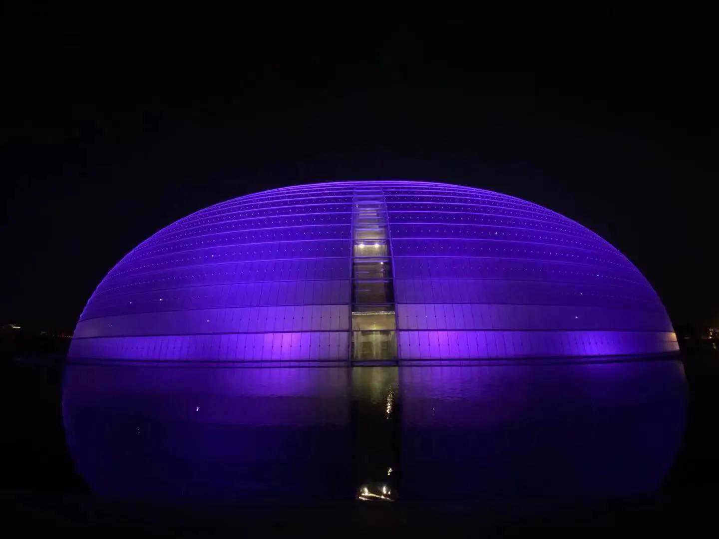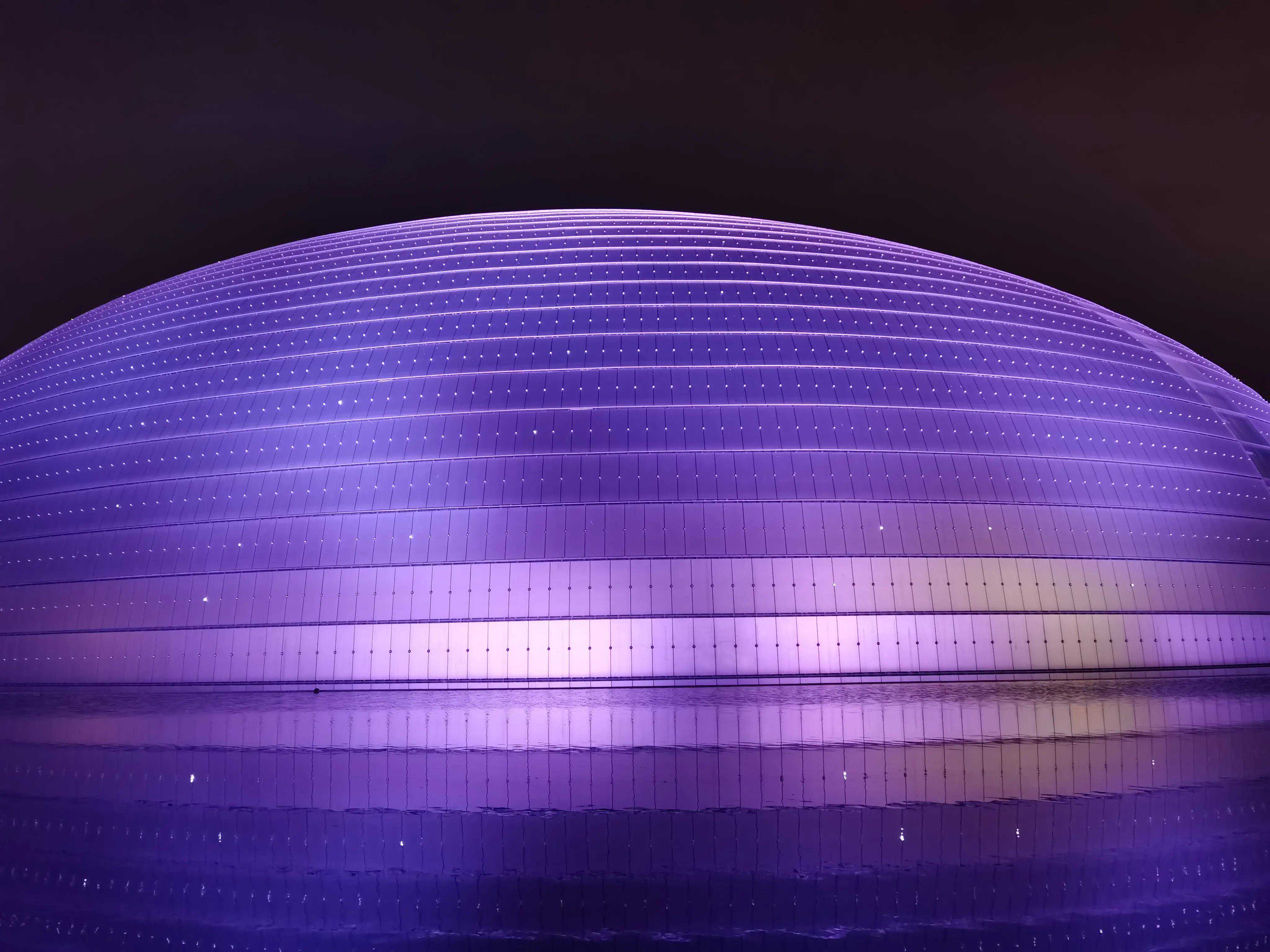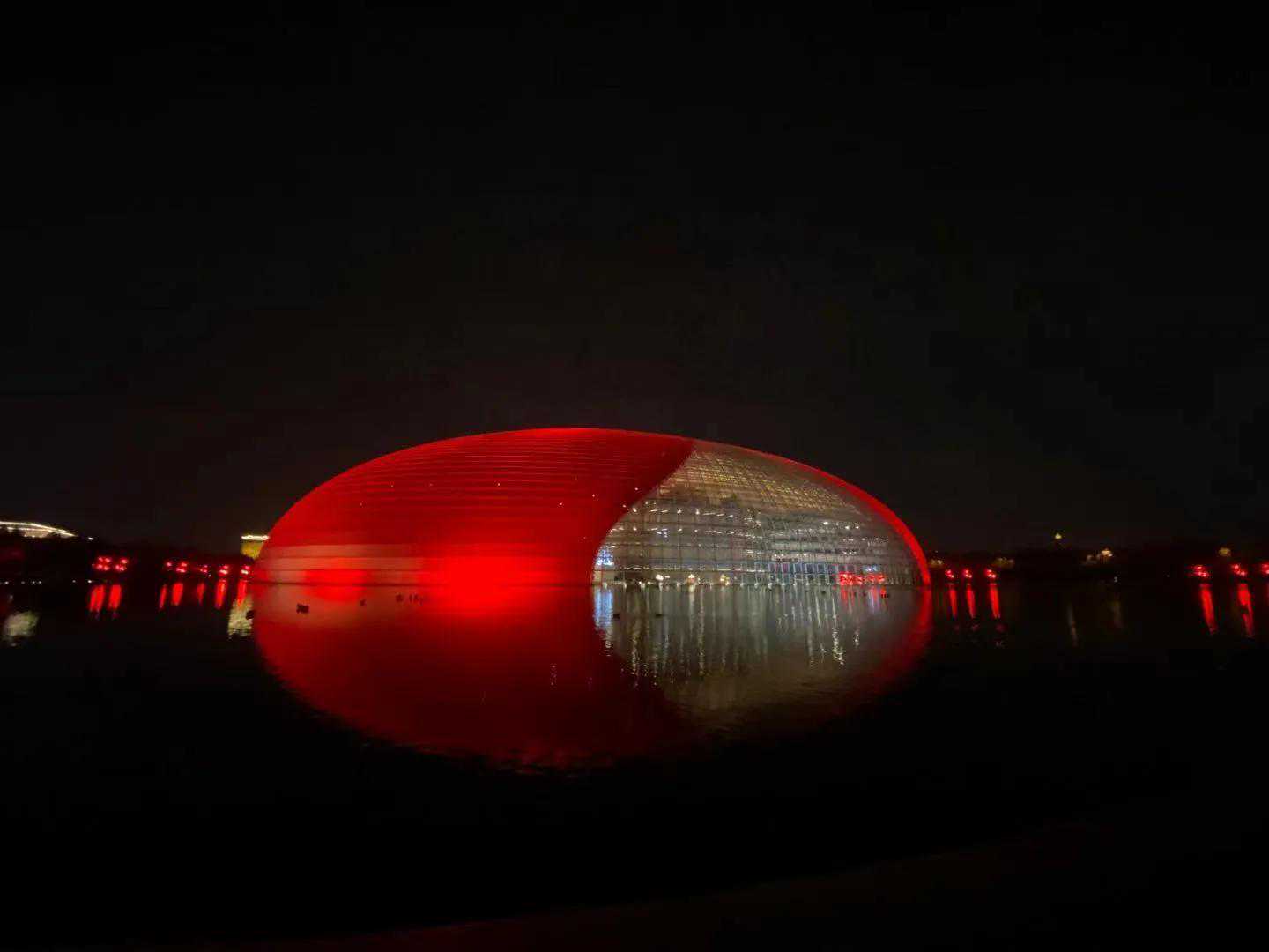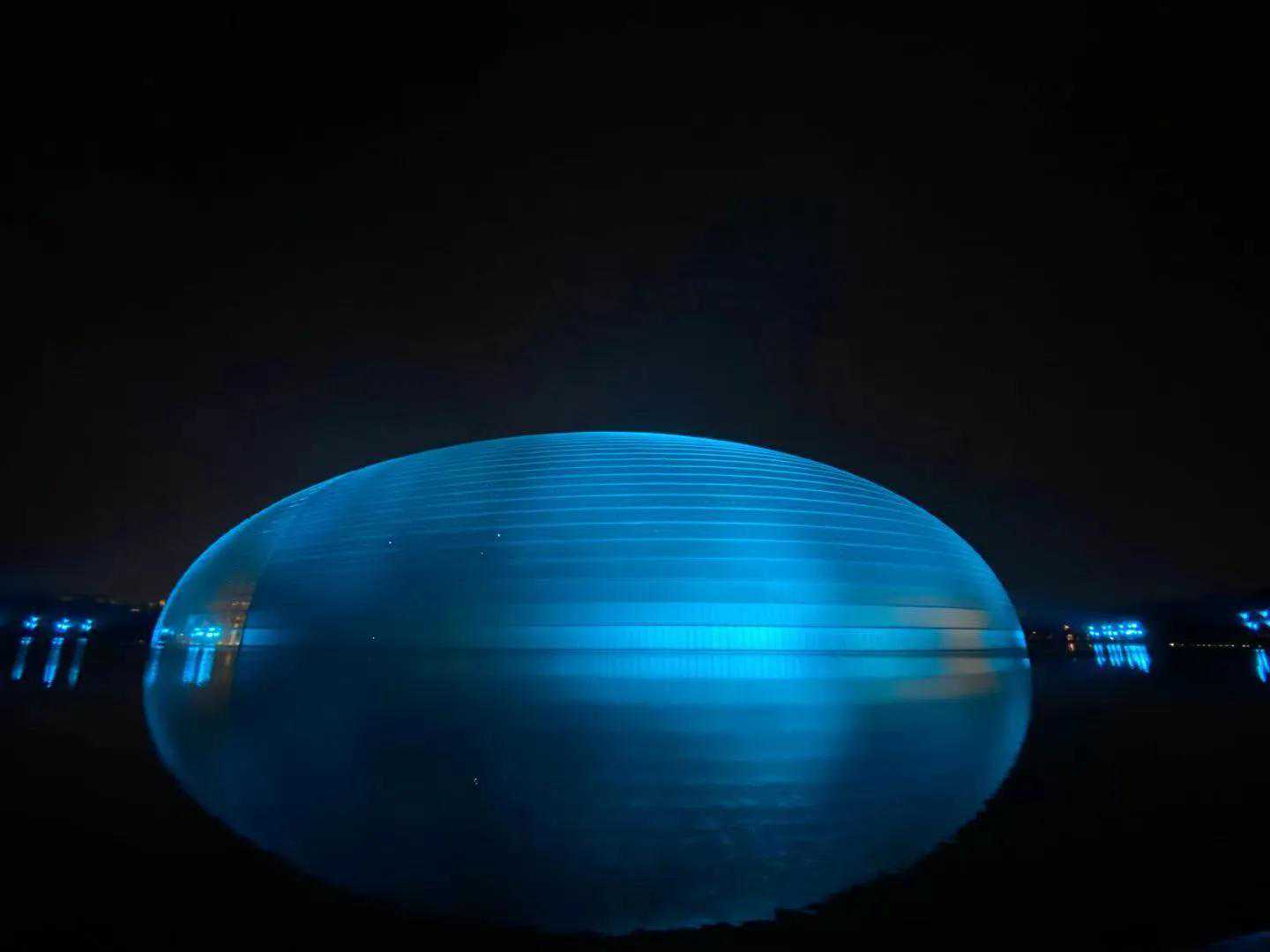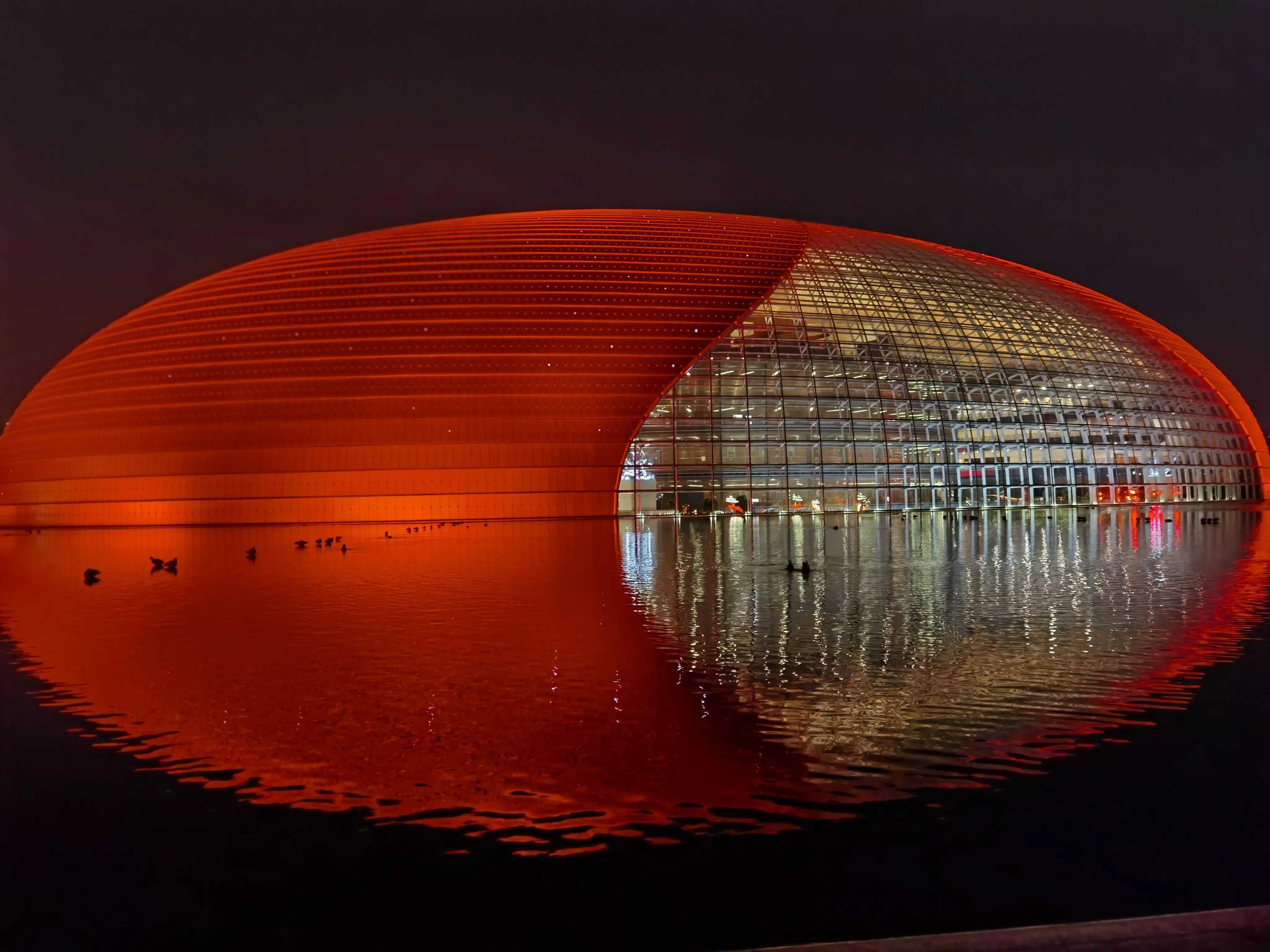 夜中的"国家大剧院"如一颗璀璨炫丽的夜明珠,变幻夺目,耀照京城,周围清波环绕,水在彩灯的笼罩下闪闪发光,晶莹斑斓,鸭子、鸳鸯浴水而戏,争相起舞,它们怎能放过这绝佳之境呢!