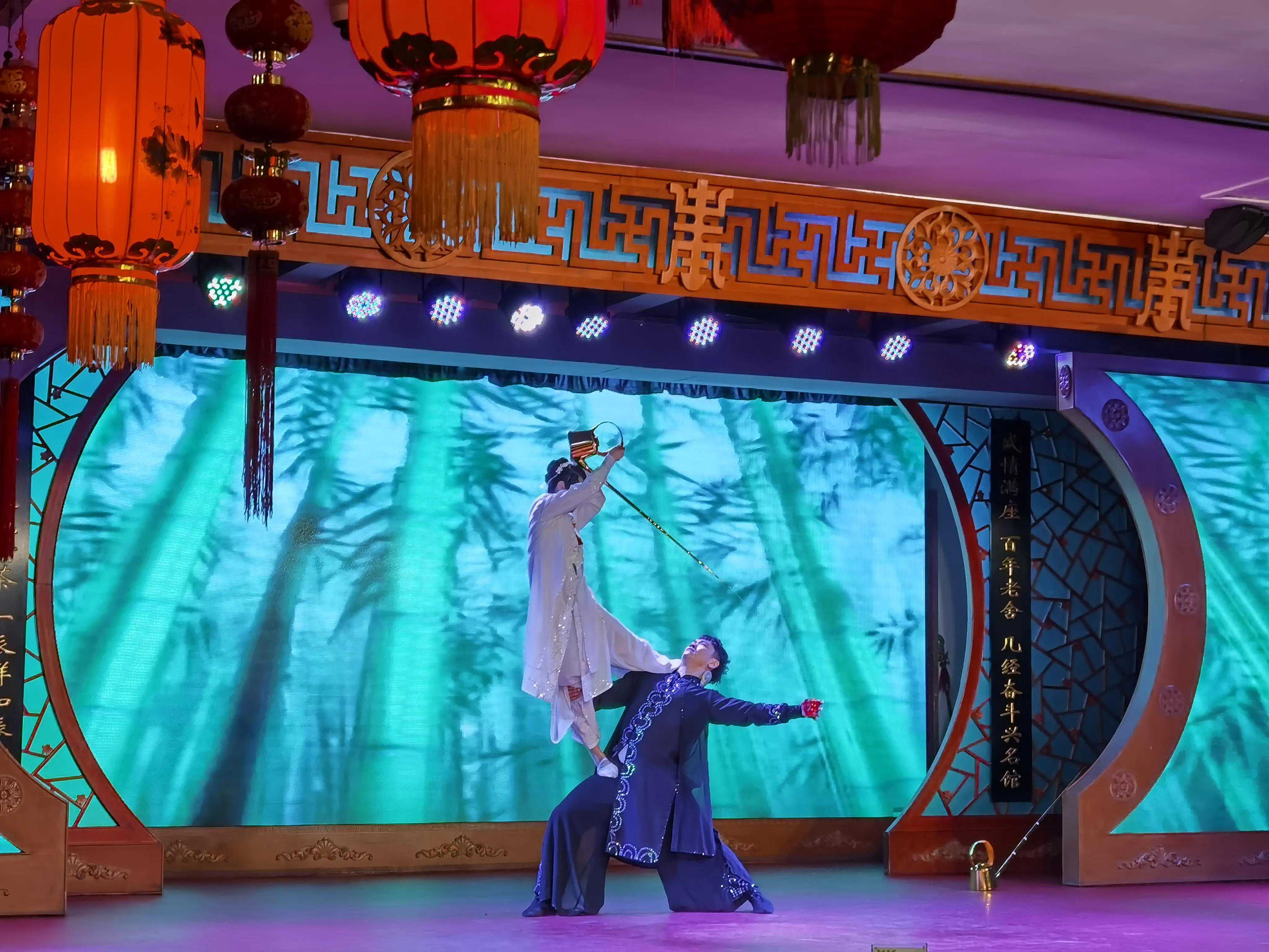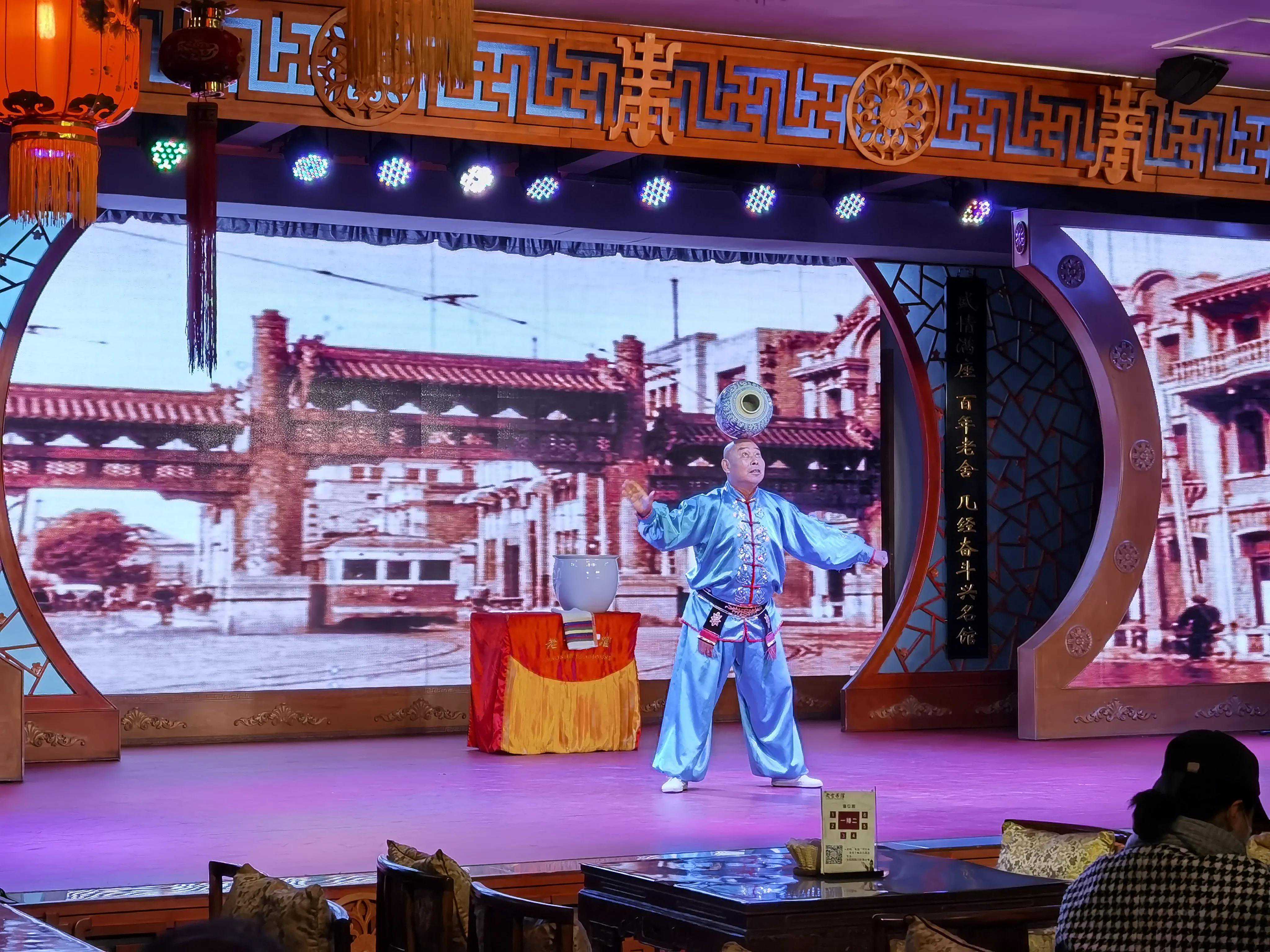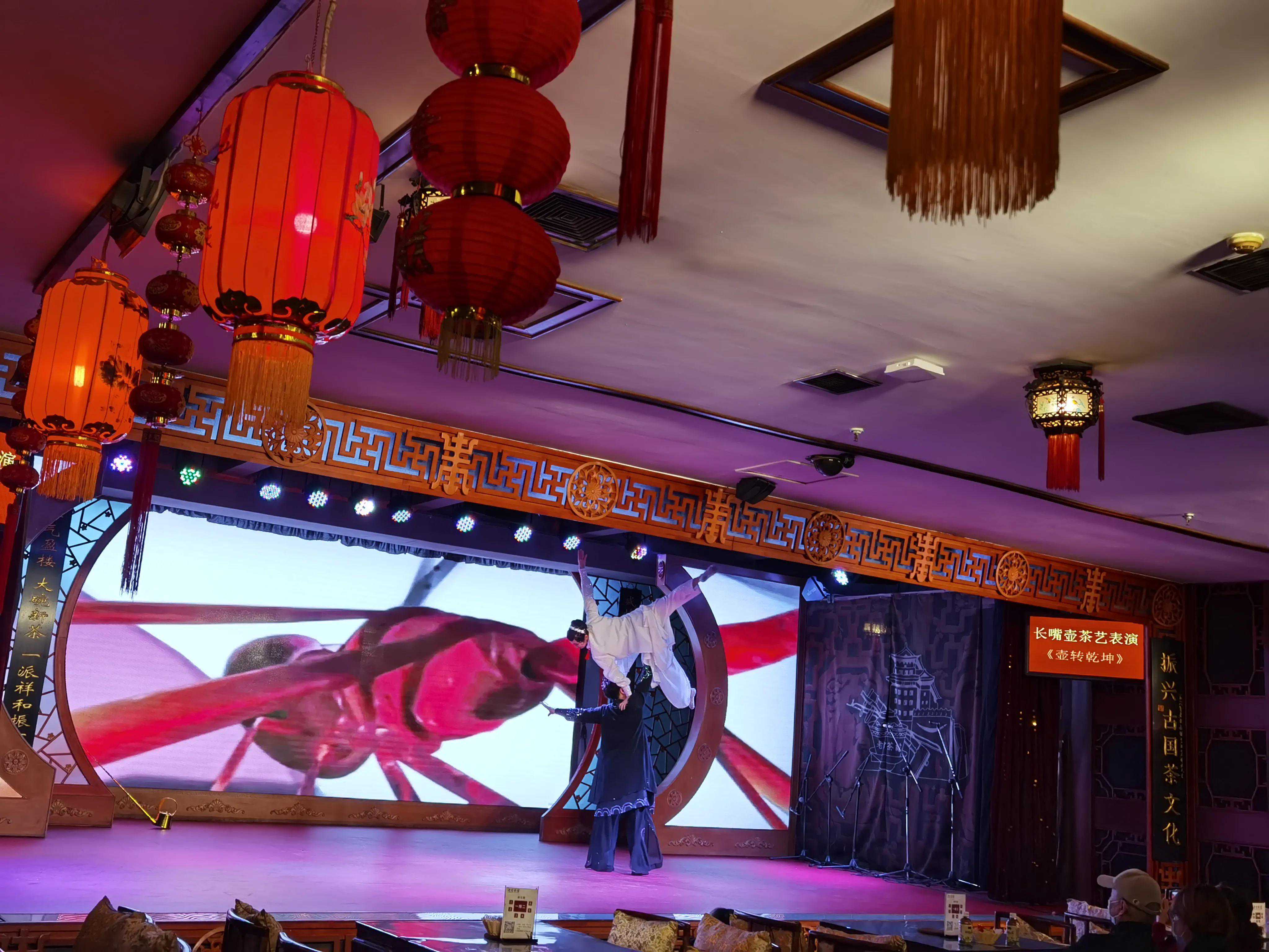 演出在三层,观众席整齐列放了几十张木桌,因疫情影响来宾人手一瓶柠檬茶落座。节目表演短小精彩,有:茶艺、京剧、相声、变脸、皮影、杂技、武术、魔术等。观众基本上是以家为单位其乐融融,祥和一片!