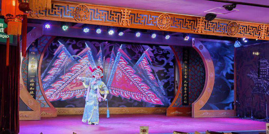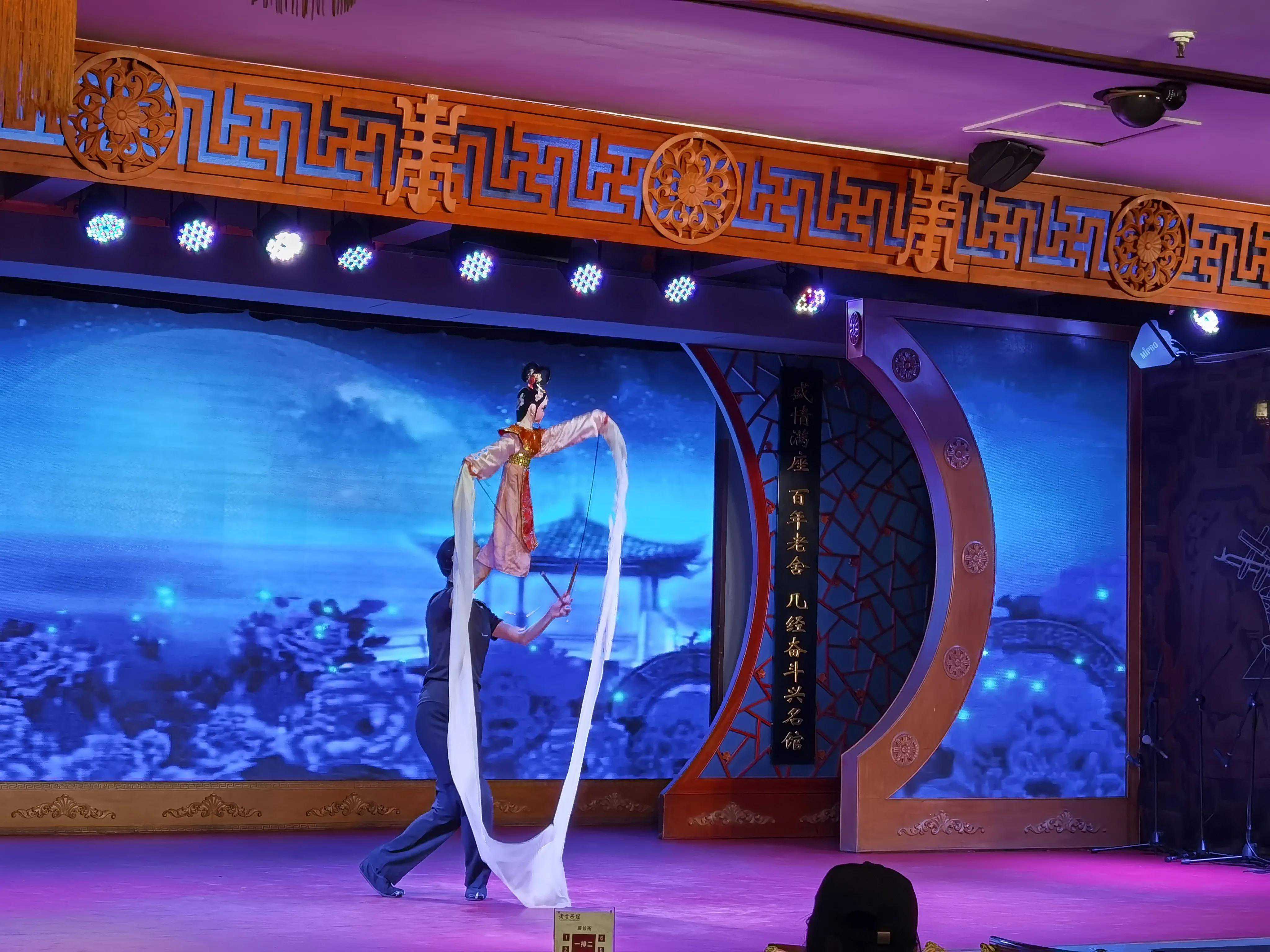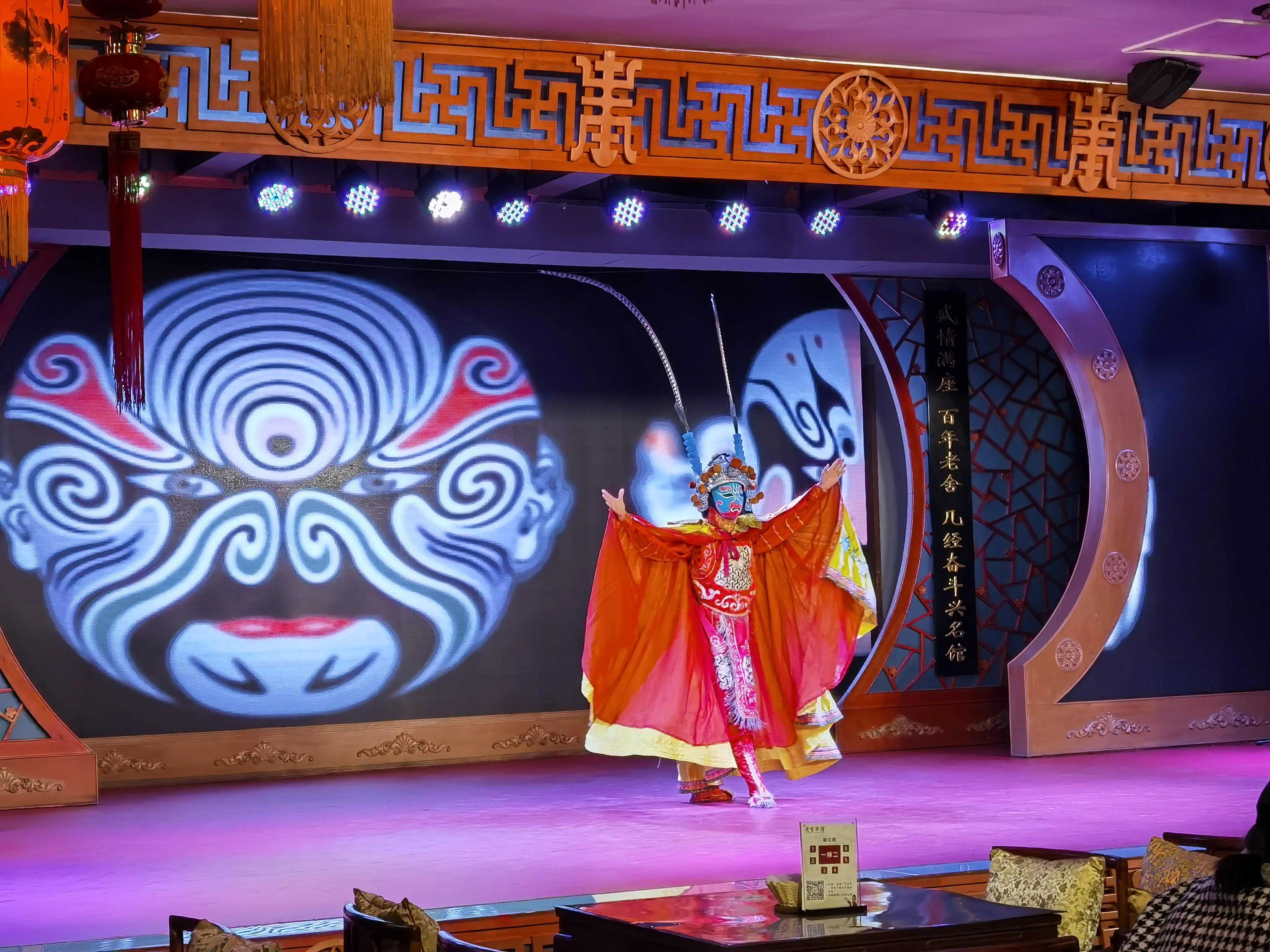 演出在三层,观众席整齐列放了几十张木桌,因疫情影响来宾人手一瓶柠檬茶落座。节目表演短小精彩,有:茶艺、京剧、相声、变脸、皮影、杂技、武术、魔术等。观众基本上是以家为单位其乐融融,祥和一片!