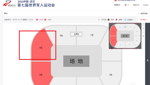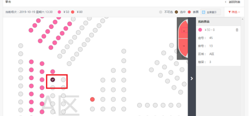第六步进去选座购票界面,红色的是可以选择的,这里选择A区,如下图所示: