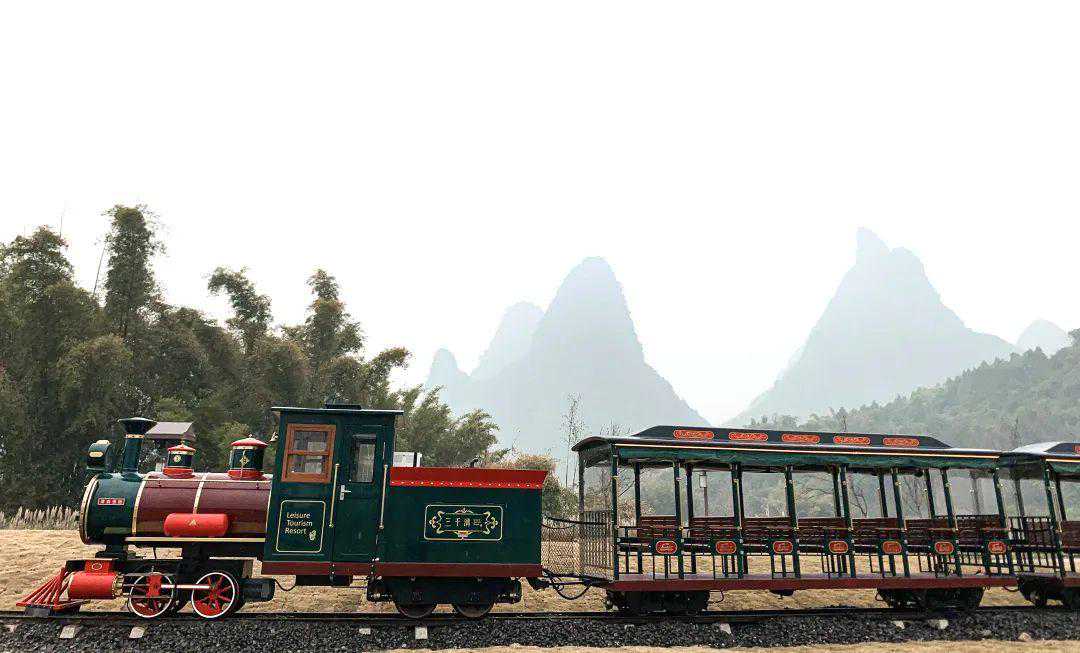 “三千漓”号列车全长1公里,全程20分钟,为单线往返列车,共3节车厢,每趟可搭载62人。“全景式”开放窗户,体验漓江边的诗意小假期,火车头复刻18世纪蒸汽火车造型,墨绿色车厢、木制座椅,与三千漓的山水风光相映成趣。