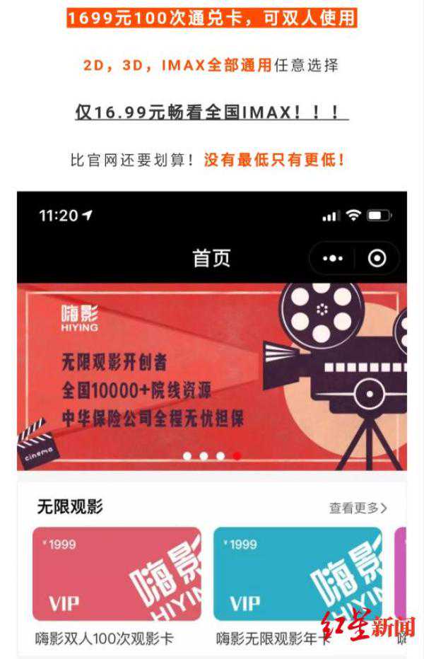 “嗨影通兑卡”的特点是消费者一次性支付1699元即可在未来一定期限内看100次电影,因此具有提前消费、企业内部使用等特性。