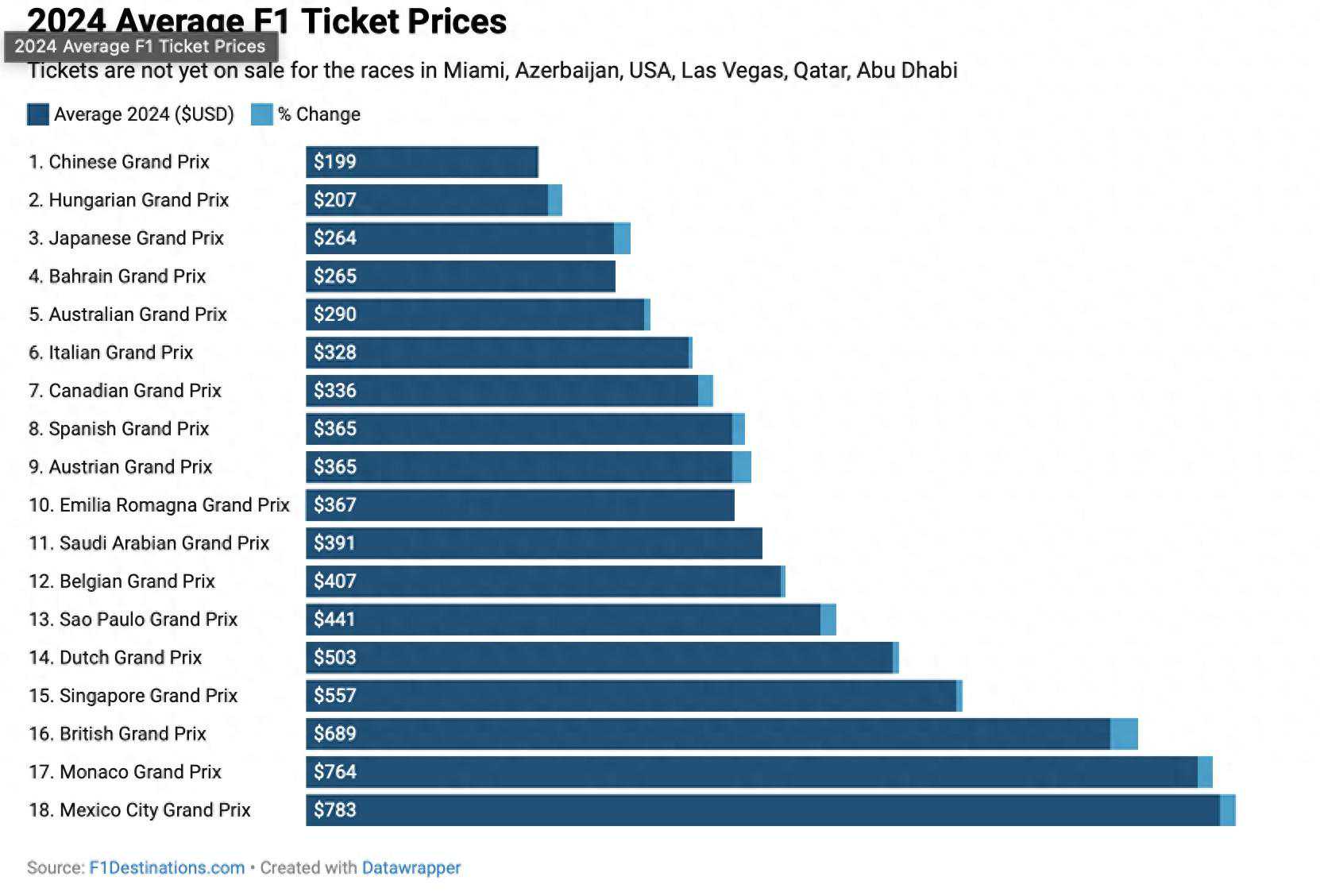 据国外媒体RANKED统计,2024赛季F1大奖赛各站的平均套票价格,其中中国站最便宜,仅199美元,最贵的是783美元的墨西哥站。