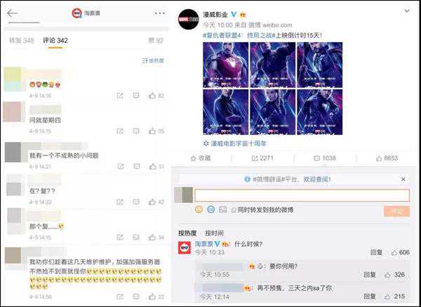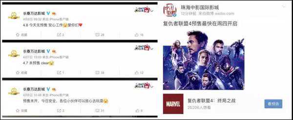 另外,不少影城微博、公众号,也都开始了催预售的队伍。不少官博开始友情提醒观众开预售时间。可见对于《复联4》的网络预售预期,可谓是达到了近年来罕见的顶级热度。