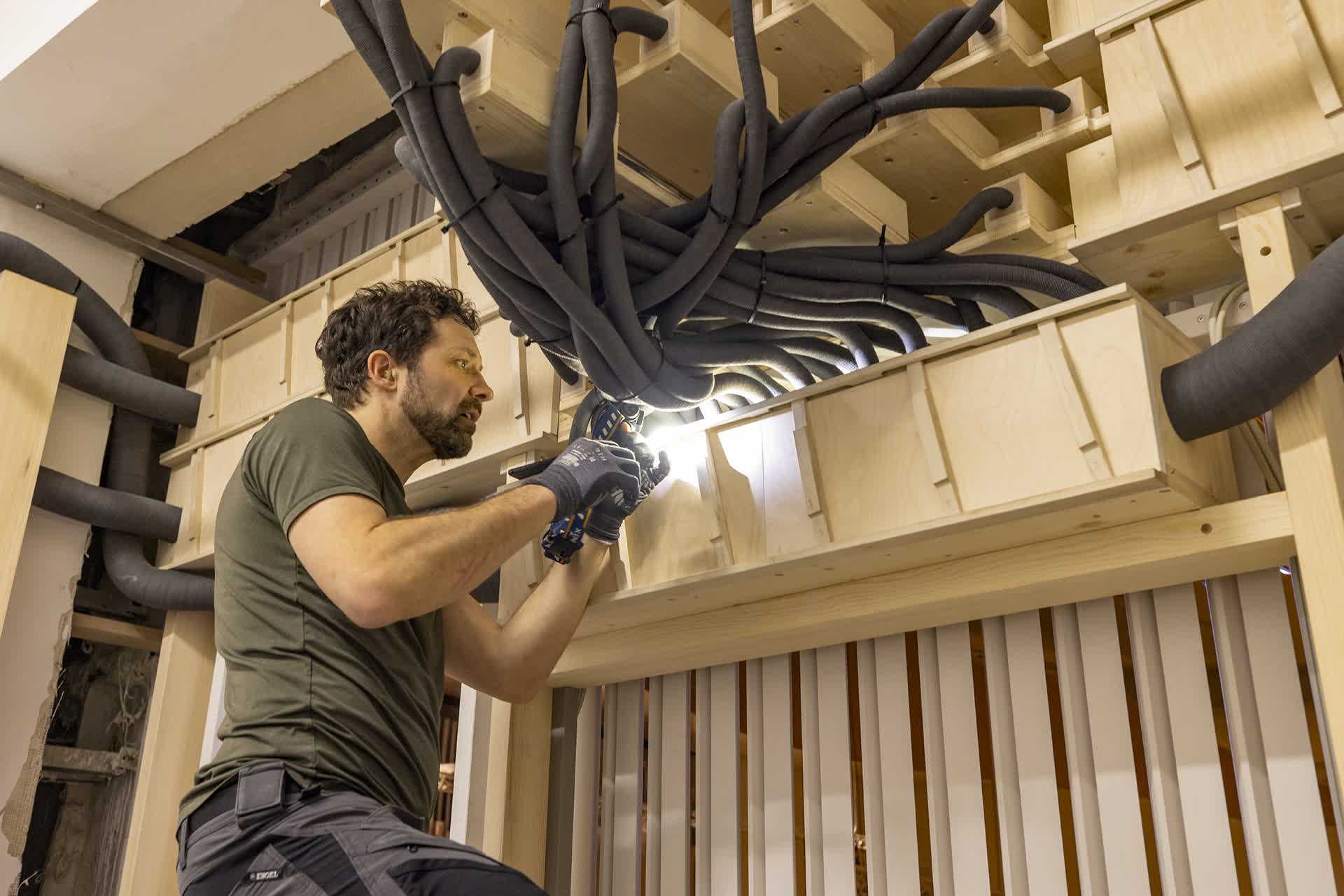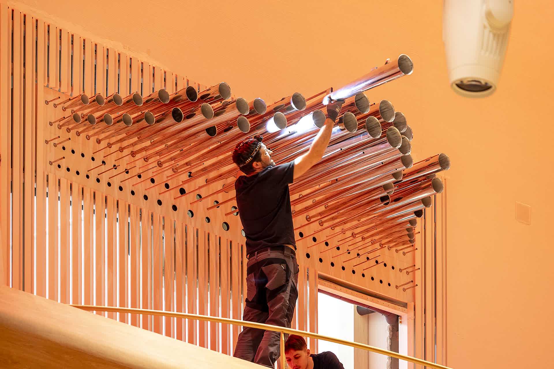 2023年6月,北京艺术中心尚未完工,里格尔的专业团队已经开始了全方位的安装调音工作。数千根音管在管风琴内部搭起了一个极其复杂又精细的小世界,从测量管风琴安装区域到地面找平,从安装电葫芦、打地基、安装支撑机构、设计防尘措施到安装鼓风机,从安装恒温恒湿机、定时除尘到安装气室,外籍专家用10个月漫长的日升月落一点点搭起这座庞然大物。迄今,里格尔已前后派12位工程师来到北京的施工现场,现在,仍有9人在为管风琴的亮相进行冲刺调试。