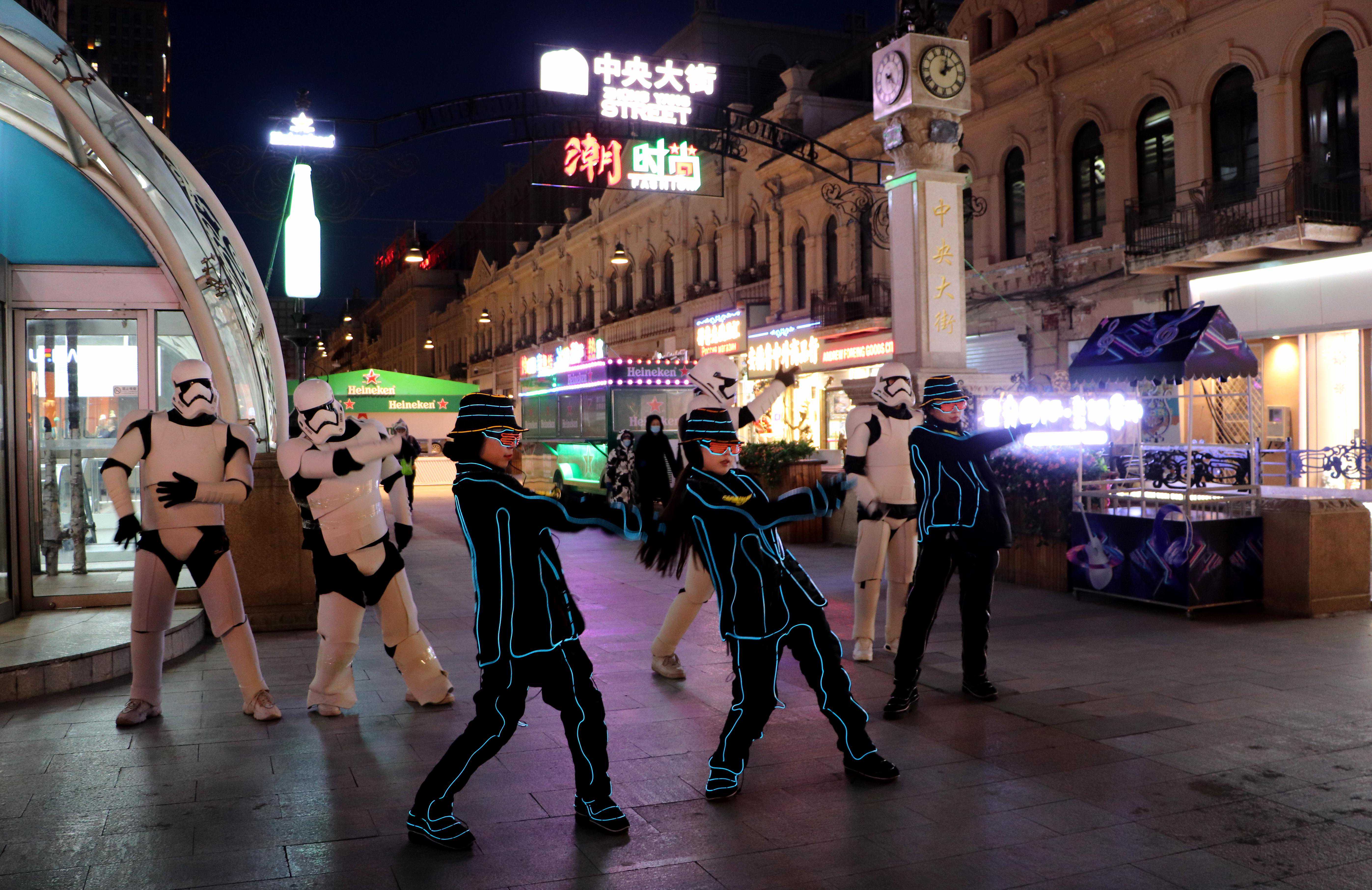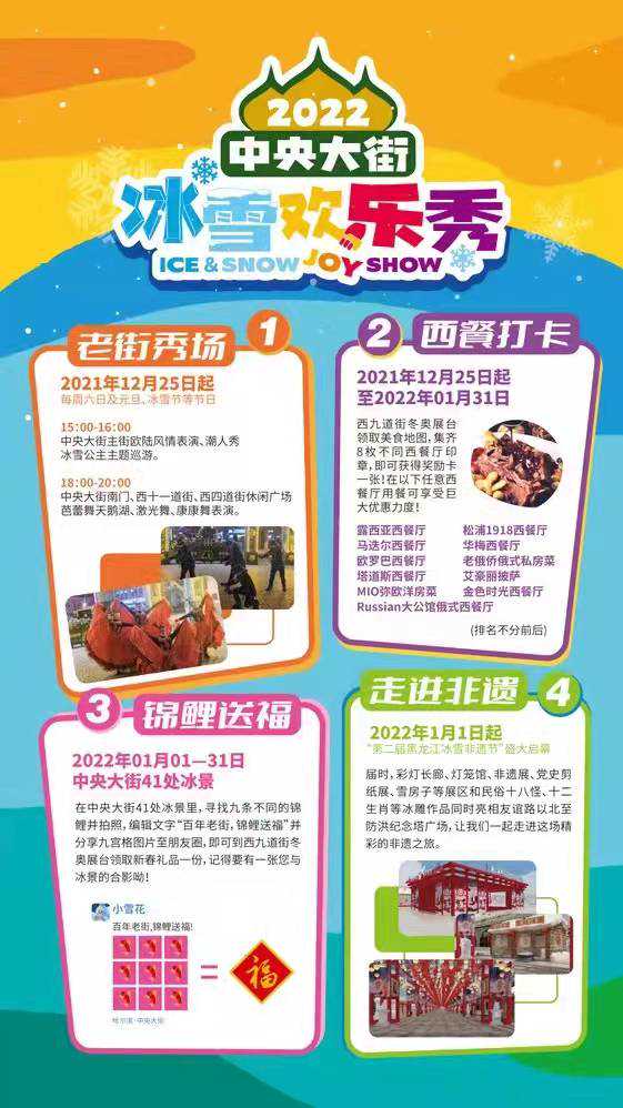 12月25日起,每周末及元旦、冰雪节等重大活动时间节点18时至20时,中央大街南门、西十一道街、西四道街休闲广场将组织街头演艺活动,同时还将有万国洋行快闪在老街欢乐上演。