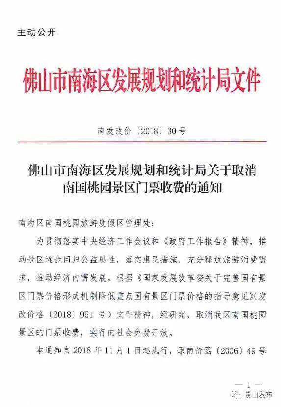佛山市南海区发展规划和统计局近日发出通知,取消南国桃园景区门票收费,11月1日起执行。