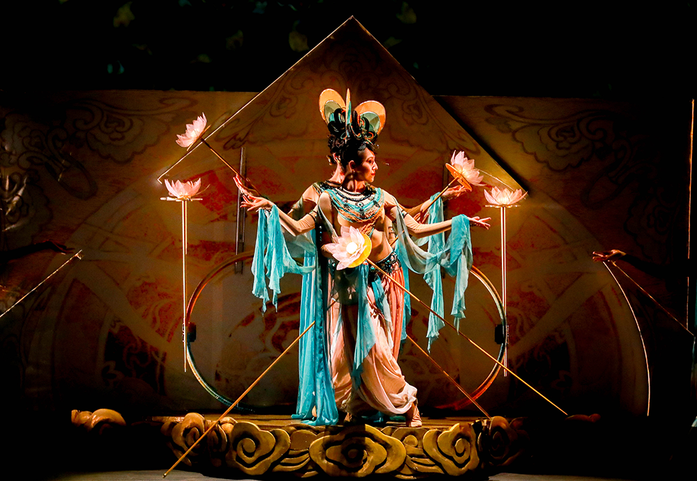 草帽、空竹和蹬鼓,经过道具等各种调整和重拍,成为了剧中棉花田里的播种和劳动场景。而吊环顶技,则幻化为如诗如幻的壁画飞天……配合剧中的多媒体,《天山雪》突破了杂技本体语汇,将戏剧、舞蹈、魔术等多种艺术形式融合在一起,让杂技的综合舞台艺术表演力和感染力极大提升。