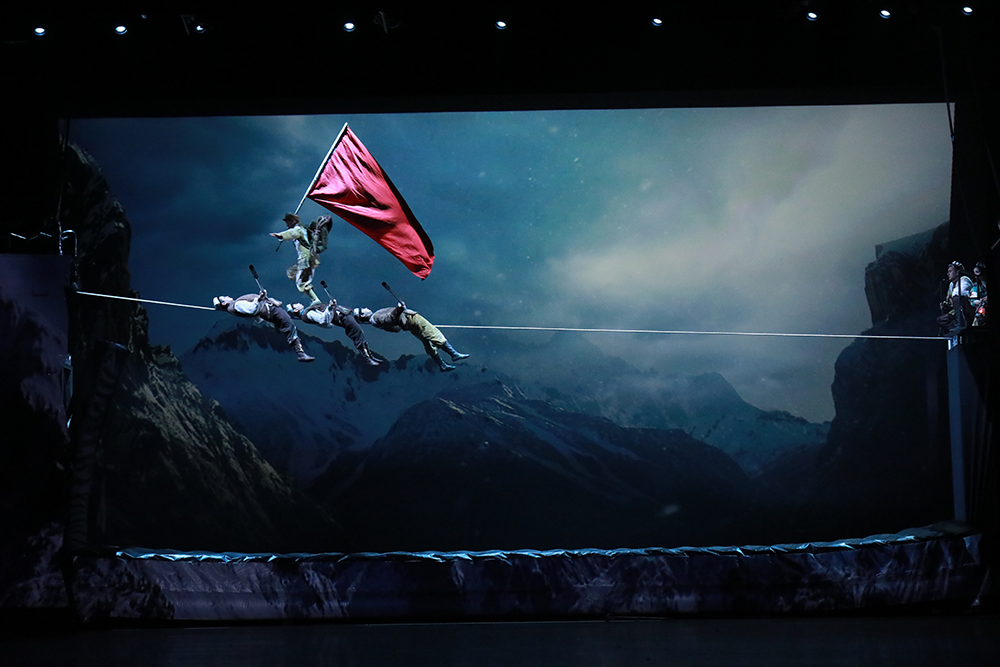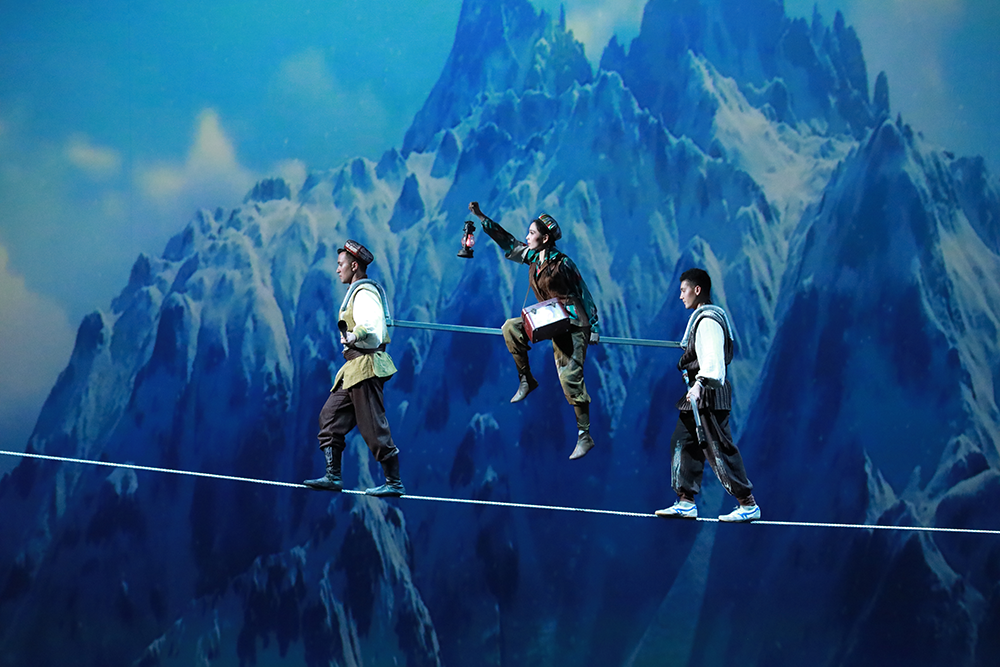 尤其值得一提的是,国家级非遗、维吾尔族高空走索技巧“达瓦孜”首度被融入杂技剧,展现了剧中规模最浩大的一幕“友谊路”。在这个故事段落中,当年为修建中巴友谊公路的历史被重现。达瓦孜第六代传人、“高空王子”阿迪力作为本剧艺术指导,多次来沪指导演员训练。而为了剧情需要,剧组改变了绳索的长度、支点、承重等多项技术参数,极大提高了演出的惊险度。“达瓦孜”也第一次从一个高难度的技巧展示,被赋予了“讲故事”的艺术任务。
