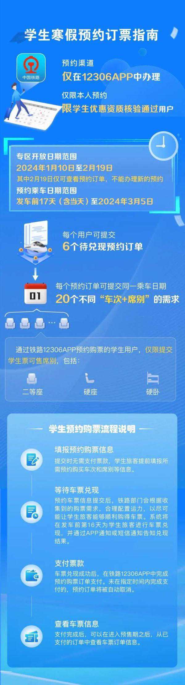 学生、务工人员可提交开车前17天(含)以上的出行购票需求,最晚可预约3月5日车票,可提交6个预约订单。