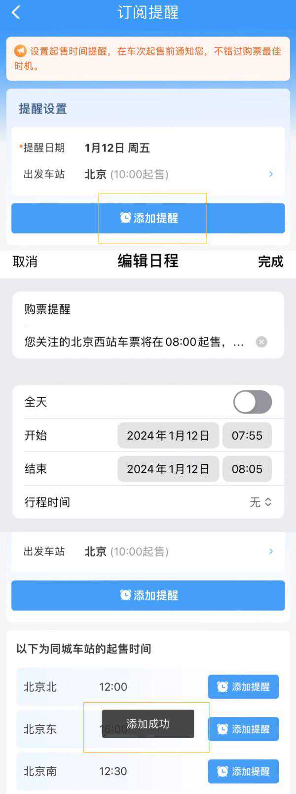 旅客可根据车票起售时间,提前通过系统设置多个提醒以便及时提交购票订单。设置提醒后,会在车票起售前通知旅客。