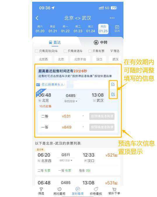 预填成功后,预选的车次会在余票列表页面置顶显示。到起售时间点时,可在余票页面快速提交订单。