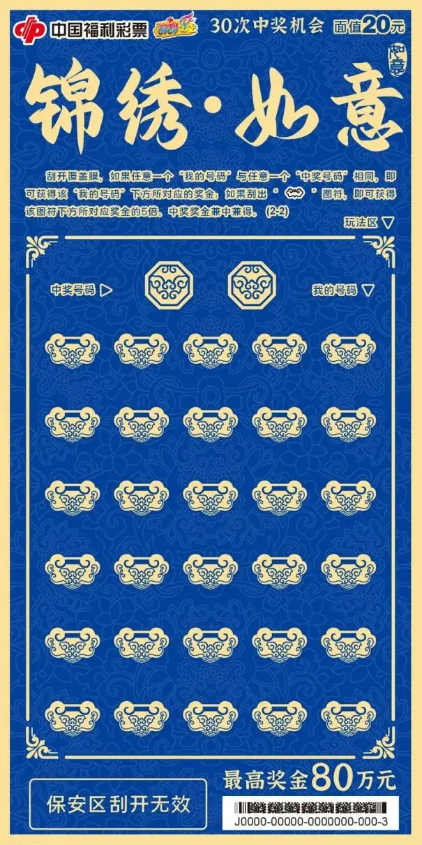 “锦绣·如意”采用“数字比对”和“特殊图符”结合的玩法,开奖体验丰富。刮开覆盖膜,如果任意一个“我的号码”与任意一个“中奖号码”相同,即可获得该“我的号码”下方所对应的奖金;如果刮出“如意”图符,即可获得该图符下方所对应奖金的5倍。中奖奖金兼中兼得。