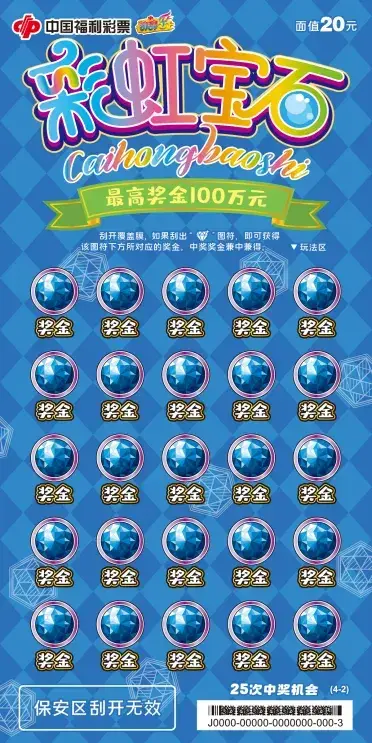 该票单张面值20元,共有8个奖级,25次中奖机会,最高奖金100万元。刮开覆盖膜,如果刮出“宝石”图符,即可获得该图符下方所对应的奖金。中奖奖金兼中兼得。