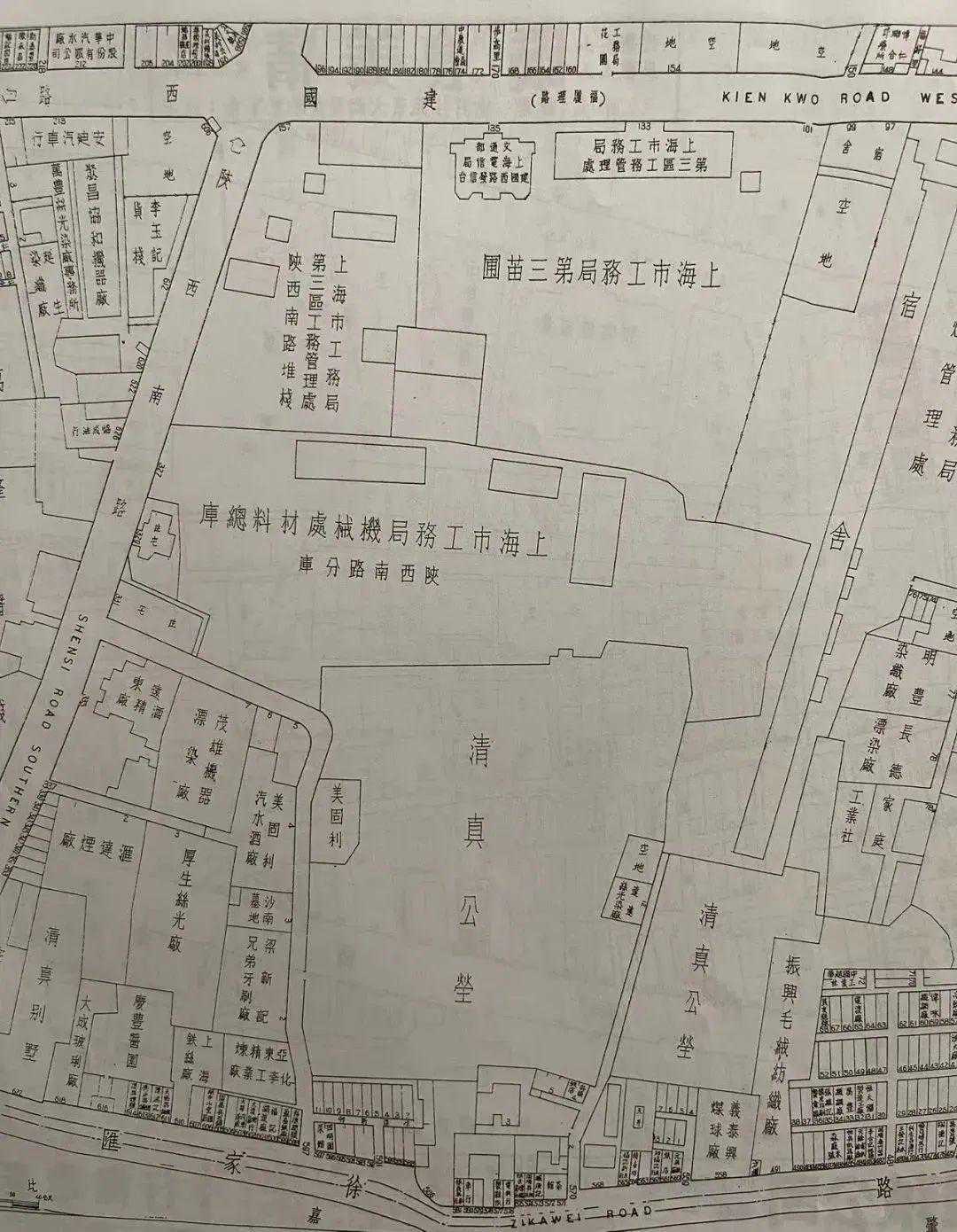 肇嘉浜路建国西路之间,现卢湾体育中心的位置,二十世纪四十年代是公墓、苗圃和仓库堆栈