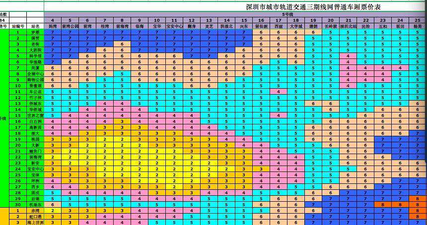 深圳城市轨道交通三期线网票价表的编制按照现行里程分段计价票制和票价标准,并遵循如下原则: