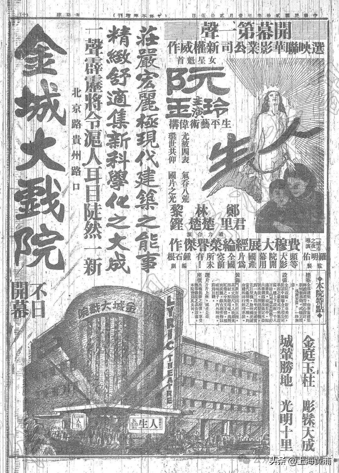1934年2月1日,金城大戏院在北京路贵州路口(今北京东路780号)开幕,上海各界人士近两千人参加了开幕典礼。2月3日正式营业。首映的是阮玲玉、郑君里、林楚楚、黎铿主演的《人生》,报评“头等大影院开幕用国产片,为全国空前所未有。”从此,金城成了“国片之宫”,一直放映着国产影片。