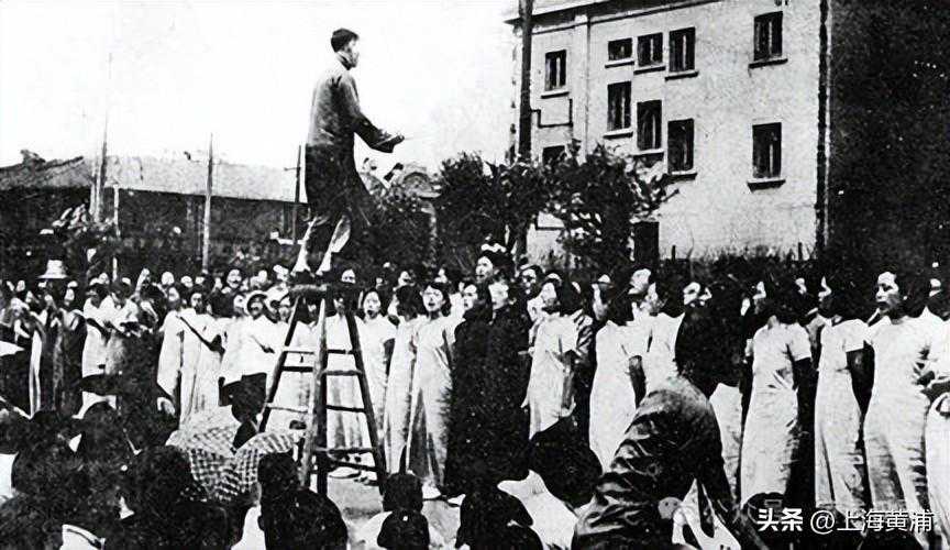 刘良模在南市公共体育场教唱《义勇军进行曲》