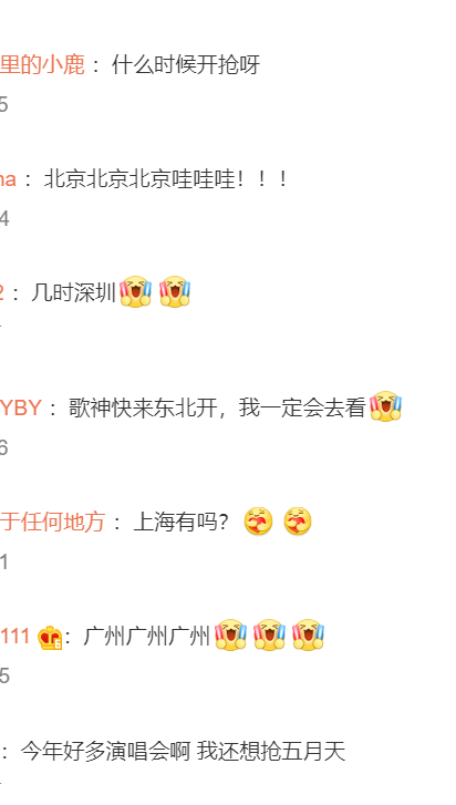 其他城市的歌迷首先纷纷提问:什么时候来广州、上海、北京、深圳……而且这么一来,确实给人一种“今年好多演唱会”的感觉有没有?