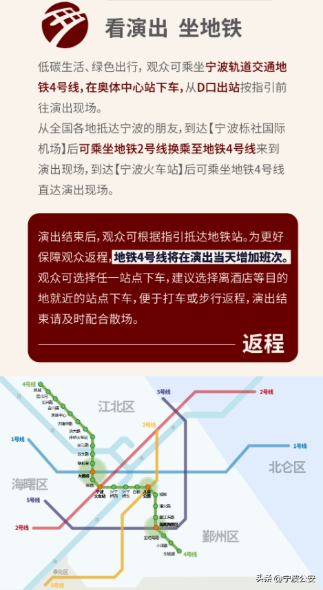 宁波奥体中心禁止车辆停放,且周边无停车场,请前往观看演出的市民优先搭乘地铁出行,地铁4号线可直达奥体中心站。轨道交通各线路将在演出当天增加运行班次,保障群众观看演出后顺利返回。