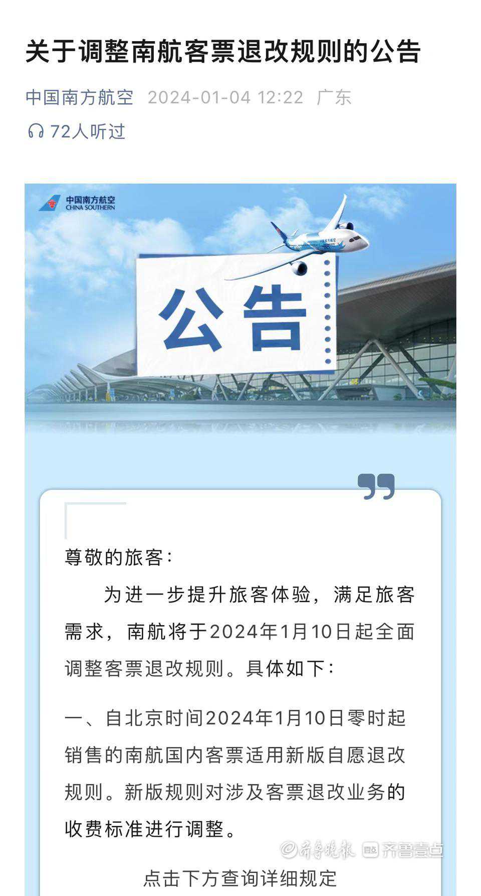 1月4日,南航公布的《关于调整客票退改规则的公告》明确:进一步扩大误操作免费退改范围。针对购票时姓名、证件、航程、日期、舱位等信息填写错误,以及误操作导致重复购票等情况,符合一定条件下可给予免费办理错购客票退票。新规从2024年1月10日起适用。