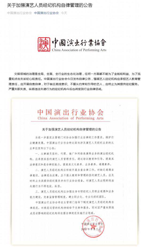 中演协同日发布的自律公告则提出,从事演员签约、代理、推广和网络表演等业务的演出经纪机构,应承担其签约演艺人员管理责任,通过培训教育和引导,提高其法律意识和是非辨别能力,提高其文化素养、业务素养、道德素养。