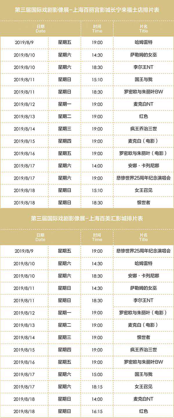 上海站的影像展将于8月9日-8月18日举行,14部风格各异的高质量戏剧现场将在上海百丽宫影城长宁来福士店、上海百美汇影城放映,实现与世界优秀剧场艺术“零时差”同步。