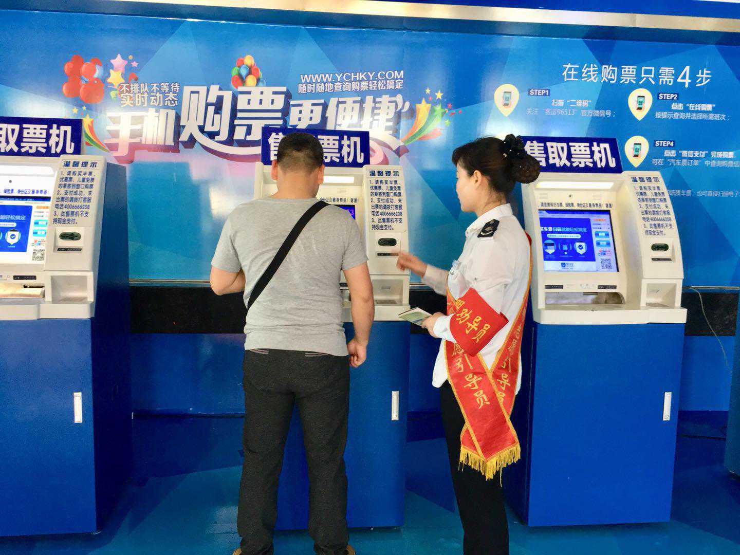 “各位旅客,大家请到自助售取票机上购票和取票,可以用微信、支付宝、银联支付,操作简单快捷。”换乘中心的引导员热情地向走进售票厅的旅客们宣传广播。