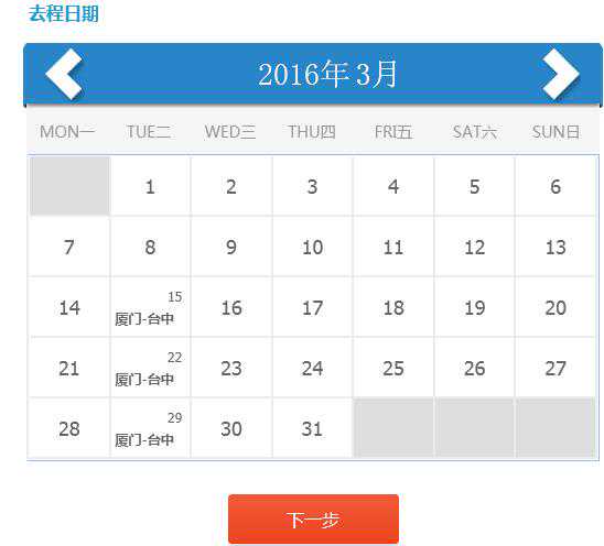 3、选择去程日期,根据自身情况进行选择。(系统会自动根据您上一步所选航线进行提示)