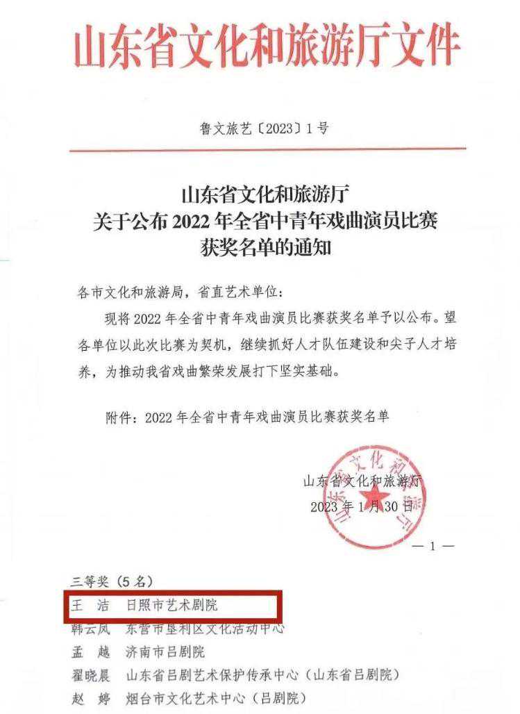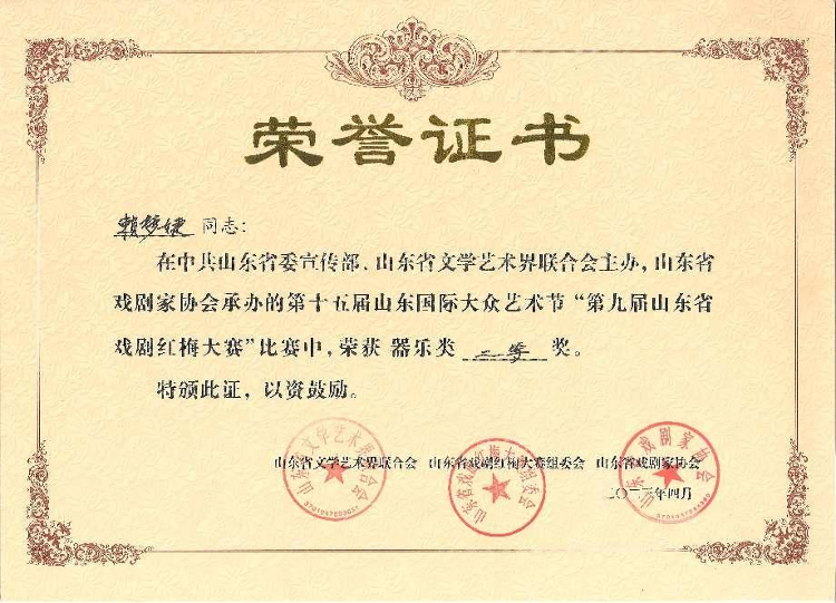 日照市艺术剧院青年演奏员获第十五届山东国际大众艺术节“第九届山东省戏剧红梅大赛”器乐类二等奖