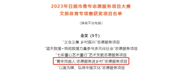日照市艺术剧院“青年戏曲人·志愿服务进乡村”志愿服务项目在2023年日照市青年志愿服务项目大赛文旅体育专项赛中荣获金奖