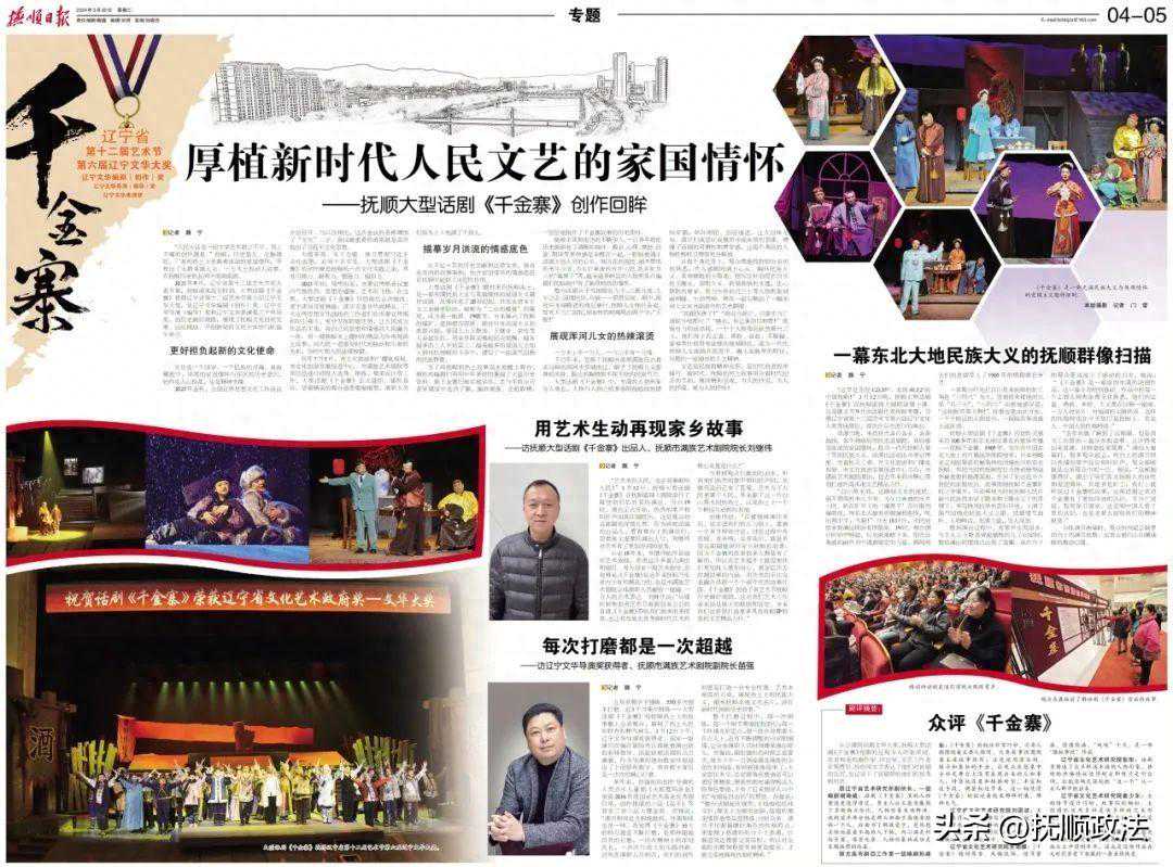 2023年9月,辽宁省第十二届艺术节在大连开幕,抚顺迎来高光时刻。大型话剧《千金寨》获得辽宁省第十二届艺术节第六届辽宁文华大奖,及辽宁文华编剧(创作)奖、辽宁文华导演(编导)奖和辽宁文华表演奖三个单项奖,创历史最好成绩,展现了抚顺文化自我发展、回应挑战、开创新局的文化主体性与旺盛生命力。