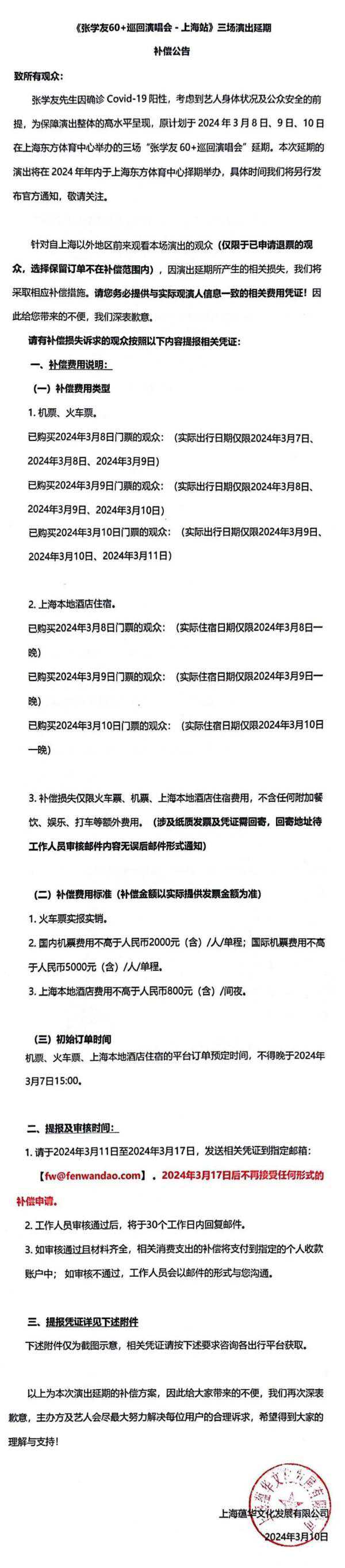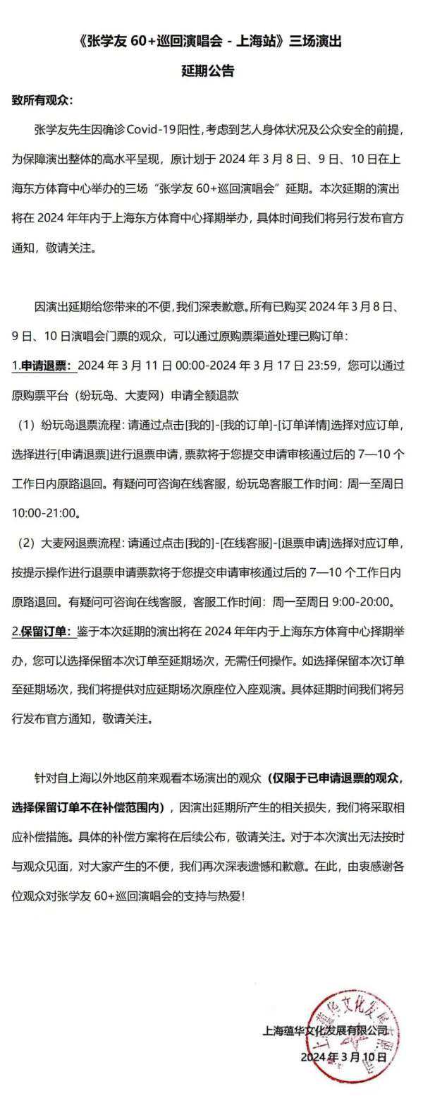 因感染新冠,原计划于2024年3月8日、9日、10日在上海东方体育中心举办的三场“张学友60+巡回演唱会”取消。3月10日晚,主办方@CMCLive华人文化演艺发布延期公告及补偿公告,称本次延期的演出将在2024年年内于上海东方体育中心择期举办。