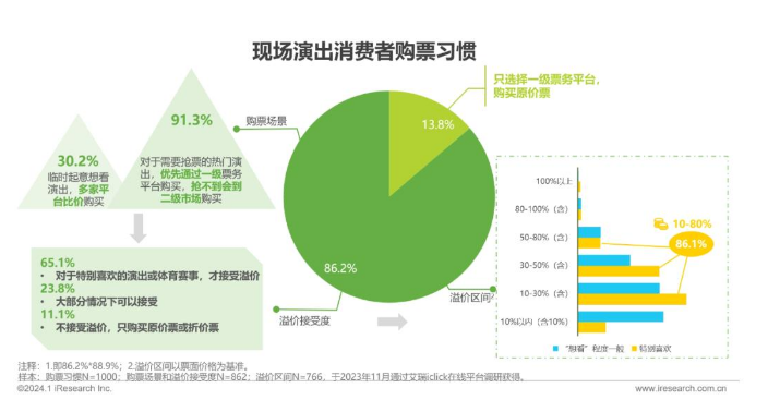 从消费者角度来,购票平台没有唯一性,尽管一级平台中的大麦占据绝对优势,但消费者们已经形成了多平台购票的习惯。调研显示,仅13.8%的消费者只选择一级票务平台购买原价票,86.2%则会使用多家平台,其中超9成在购买热门演出时优先通过一级票务平台购买,抢不到会到二级市场购买,另有30.2%的购票场景为临时想看演出,这种情况下选用多家购票平台是为了进行比价。