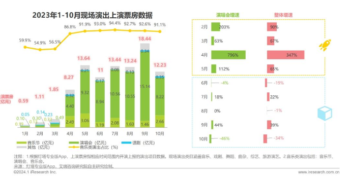 根据灯塔专业版App,从整体现场演出上演票房数据来看,在低基数和疫情放开后需求集中释放的共同作用下,4月份迎来增速波峰,音乐类演出占比也从55%上下一跃而起至86.8%,进入下半年,增速回落趋势明显,特别是今年一路高歌猛进的演唱会在10月份出现了负增长,上演票房环比下降46%。