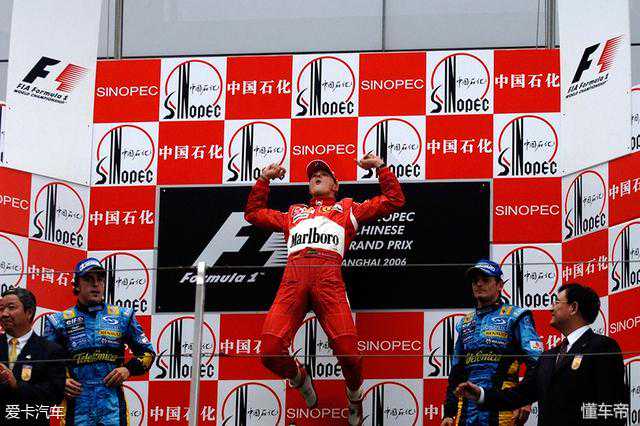 最终,舒马赫没有让中国车迷失望。在淅淅沥沥的小雨中,“雨神”舒马赫完成了对阿隆索和费斯切拉的两次精彩超越,方格旗之后登上了上海站的最高领奖台。