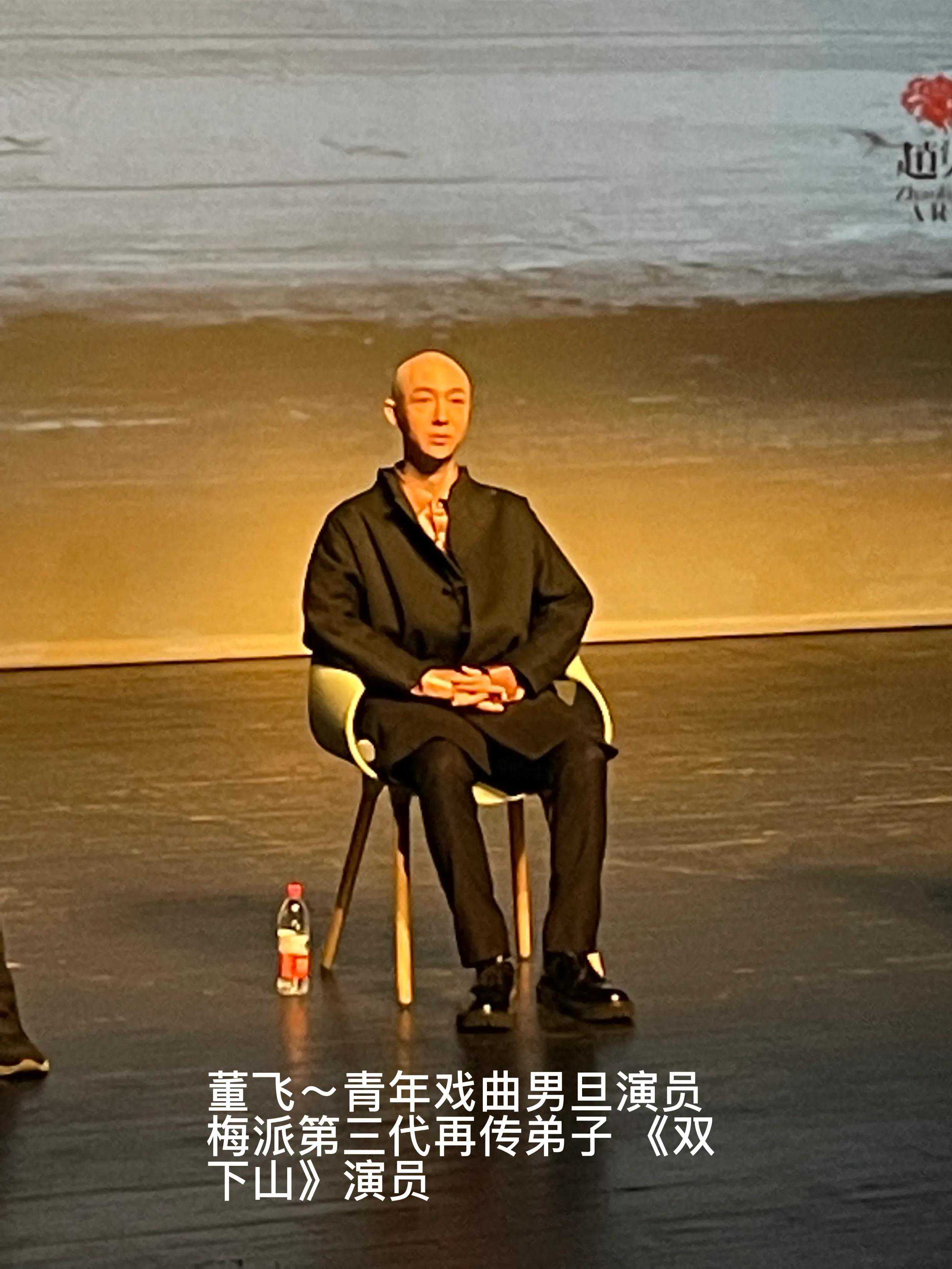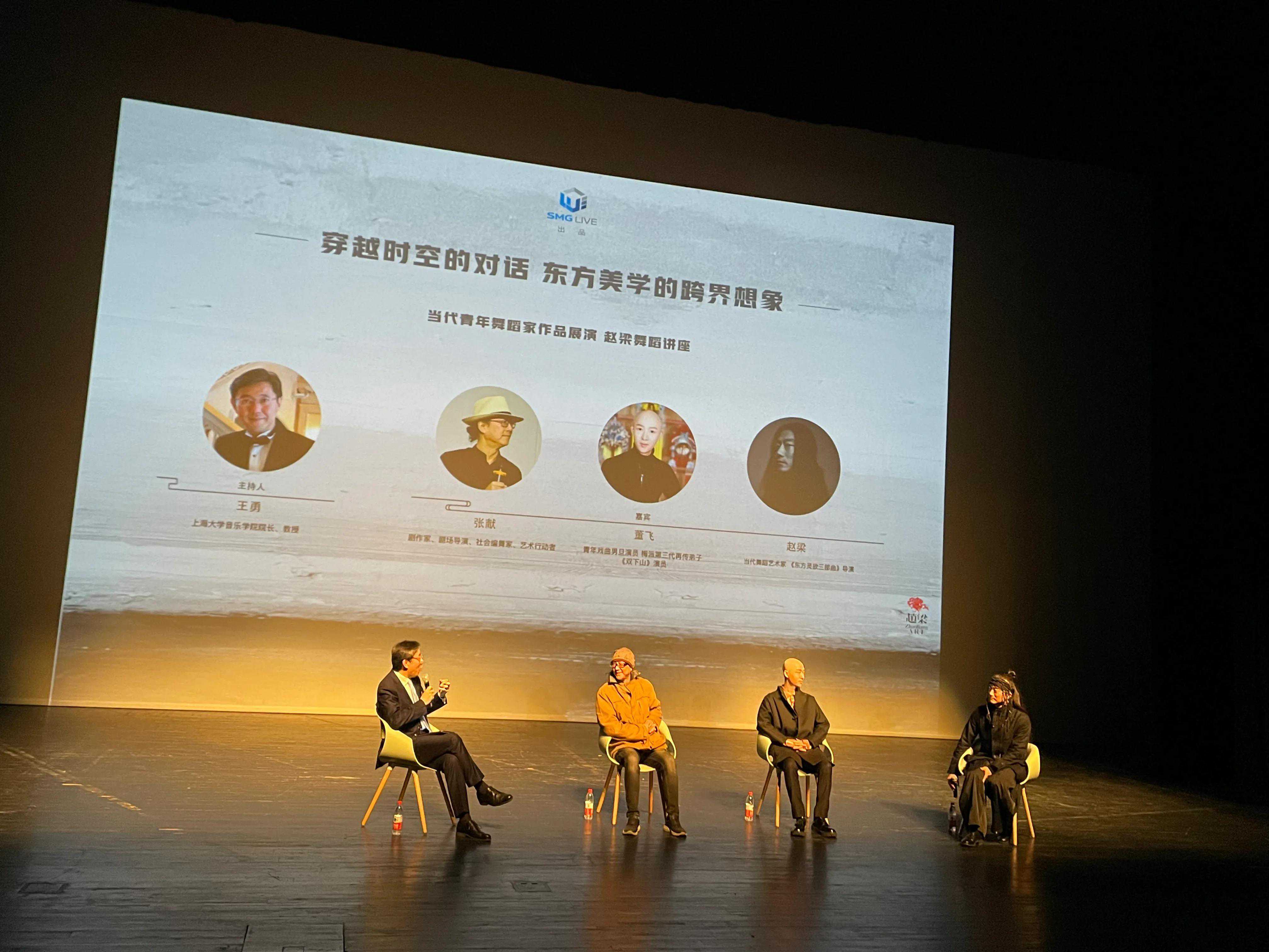 整场讲座一个多小时,人物四位,主持人上海大学音乐学院院长王勇;剧作家、剧场导演、社会编舞家、艺术行动者张献;青年戏曲男旦演员、梅派第三代弟子,也是《双下山》主演董飞;当代舞蹈艺术家、三部曲导演赵梁。谈到到底是导演塑造了角色,还是角色需要演员,赵梁说了一句话:“