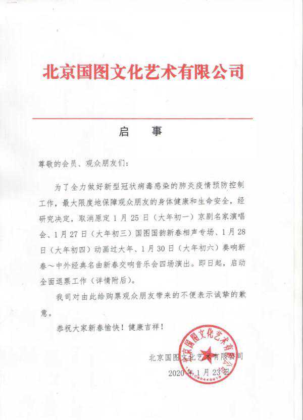 为了全力做好新型冠状病毒感染的肺炎疫情预防控制工作,最大限度地保障观众朋友的身体健康和生命安全,经研究决定,取消原定1月25日(大年初一)京剧名家演唱会、1月27日(大年初三)国图国韵新春相声专场、1月28日(大年初四)动画过大年、1月30日(大年初六)奏响新春~中外经典名曲新春交响音乐会四场演出。即日起,启动全面退票工作(详情附后)。