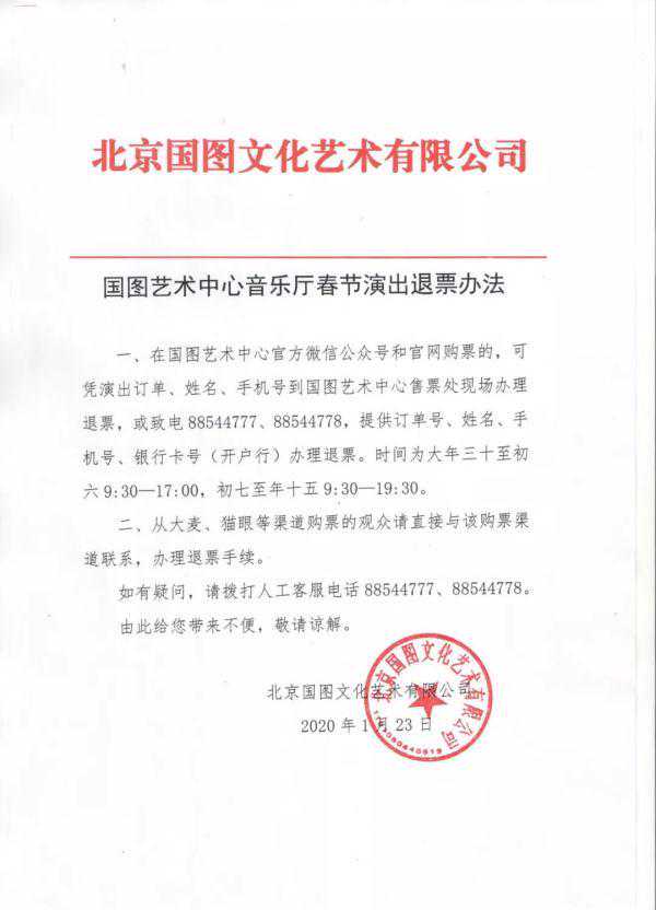 一、在国图艺术中心官方微信公众号和官网购票的,可凭演出订单、姓名、手机号到国图艺术中心售票处现场办理退票,或致电88544777、88544778,提供订单号、姓名、手机号、银行卡号(开户行)办理退票。时间为大年三十至初六9:30—17:00,初七至年十五9:30—19:30。二、从大麦、猫眼等渠道购票的观众请直接与该购票渠道联系,办理退票手续。如有疑问,请拨打人工客服电话88544777、88544778。由此给您带来不便,敬请谅解。北京国图文化艺术有限公司2020年1月23日
