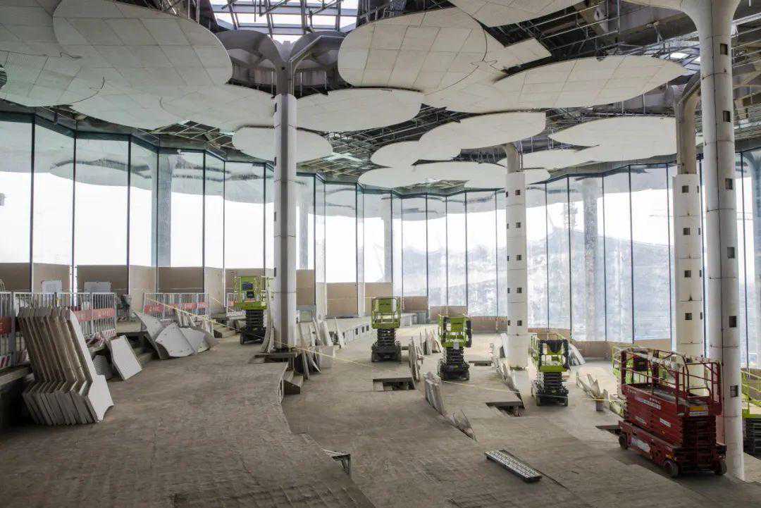 走进北京城市图书馆,山间树下的“森林书苑”已经初具雏形。144根立柱宛如树干,银杏叶片交叠撑起一片森林,两座三层高的书山耸立,书籍与坐席依山而布,记者现场看到,在两座书山之间,施工团队正在进行加气混凝土作业,机器轰鸣作响,为图书馆的竣工做最后的施工准备。